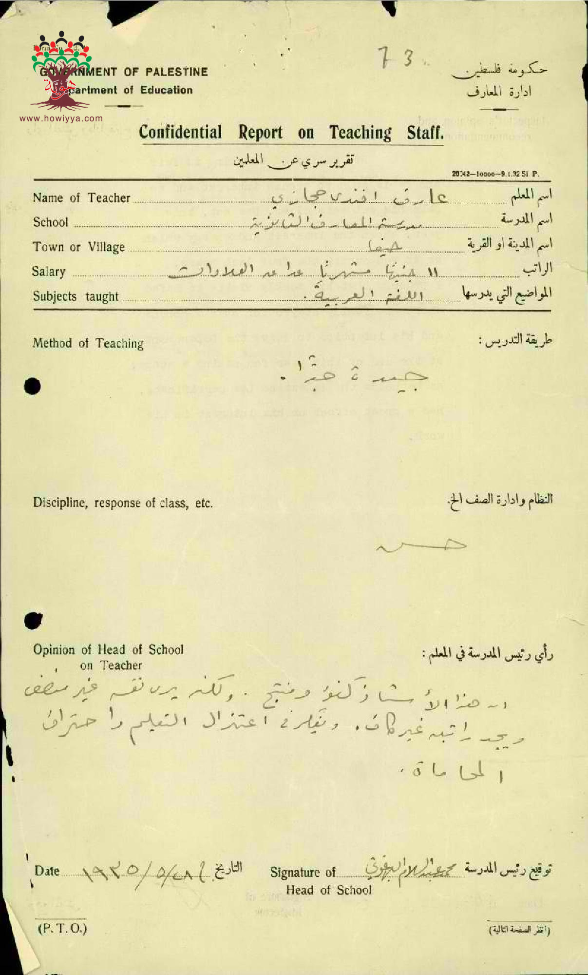 رأي مدير مدرسة حيفا محمد البرغوثي بالمعلم عارف حجازي - صفد
