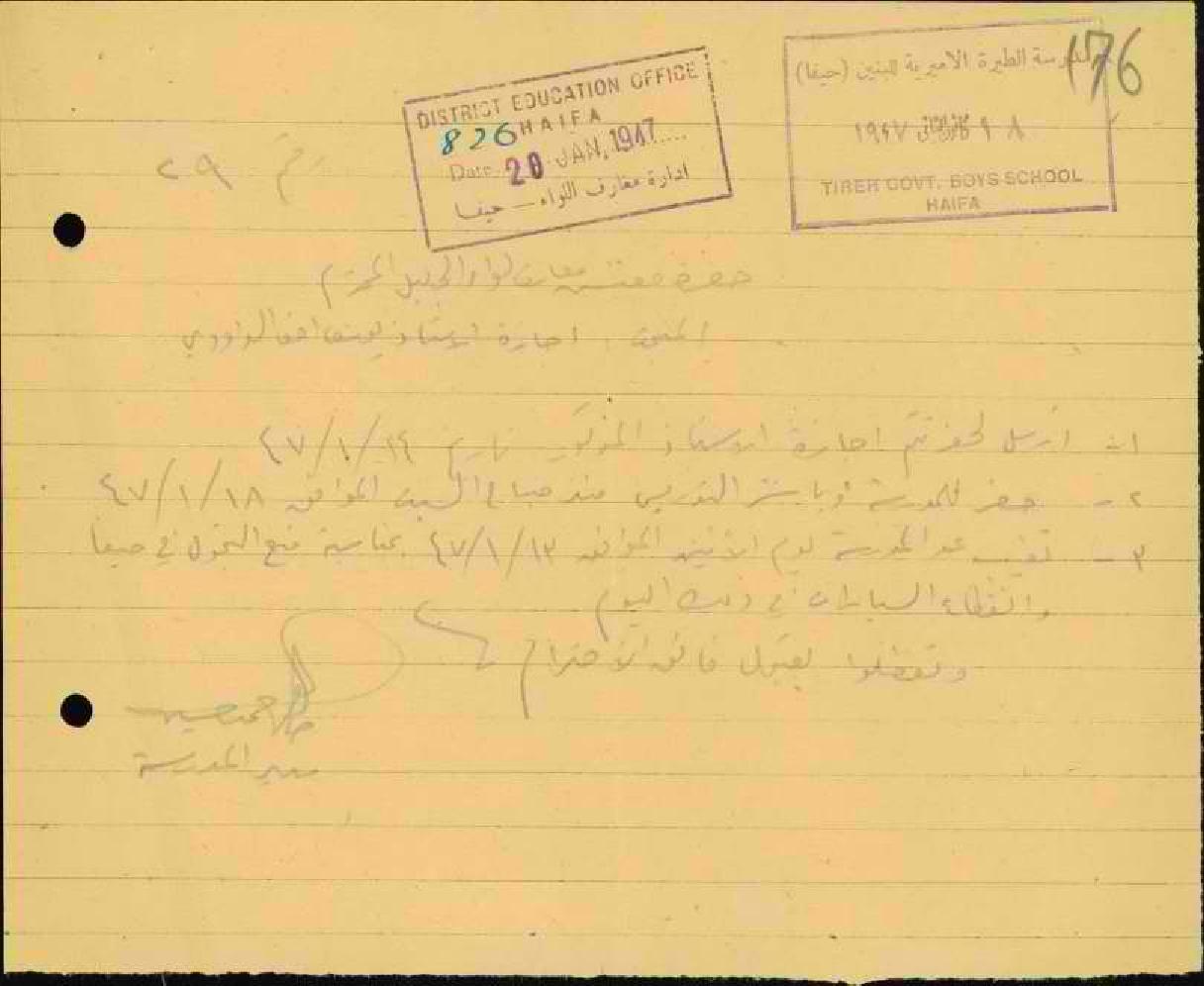 رسالة من مدير مدرسة الطيرة الى مفتش المعارف بخصوص تغيب المعلم يوسف الداودي وعودته الى العمل