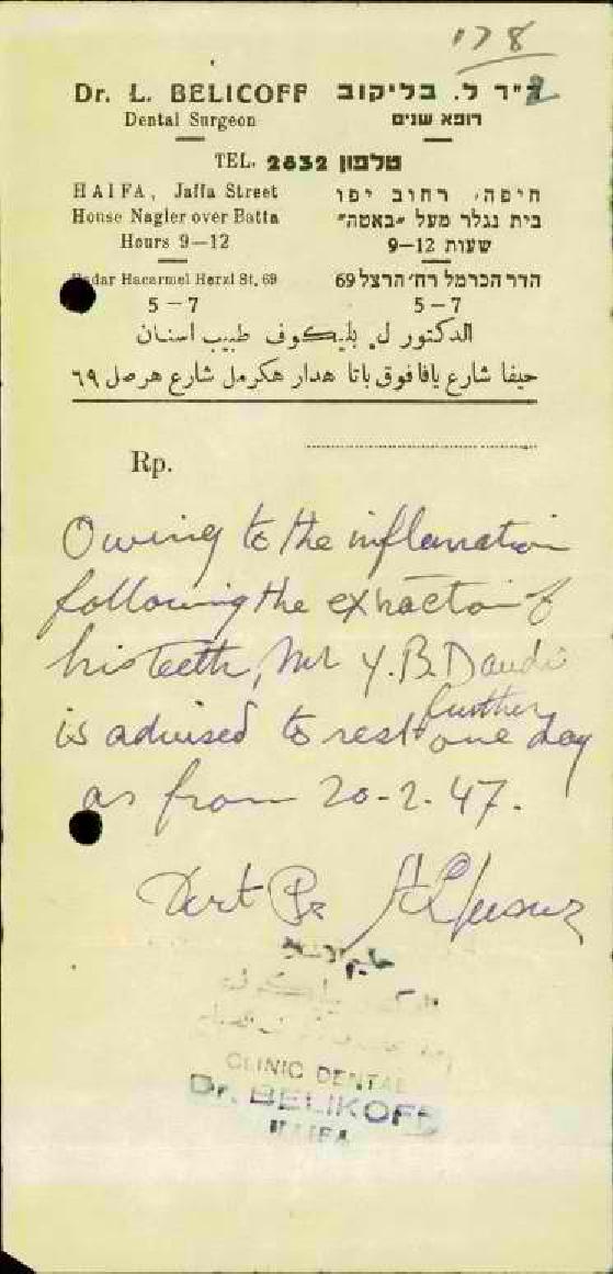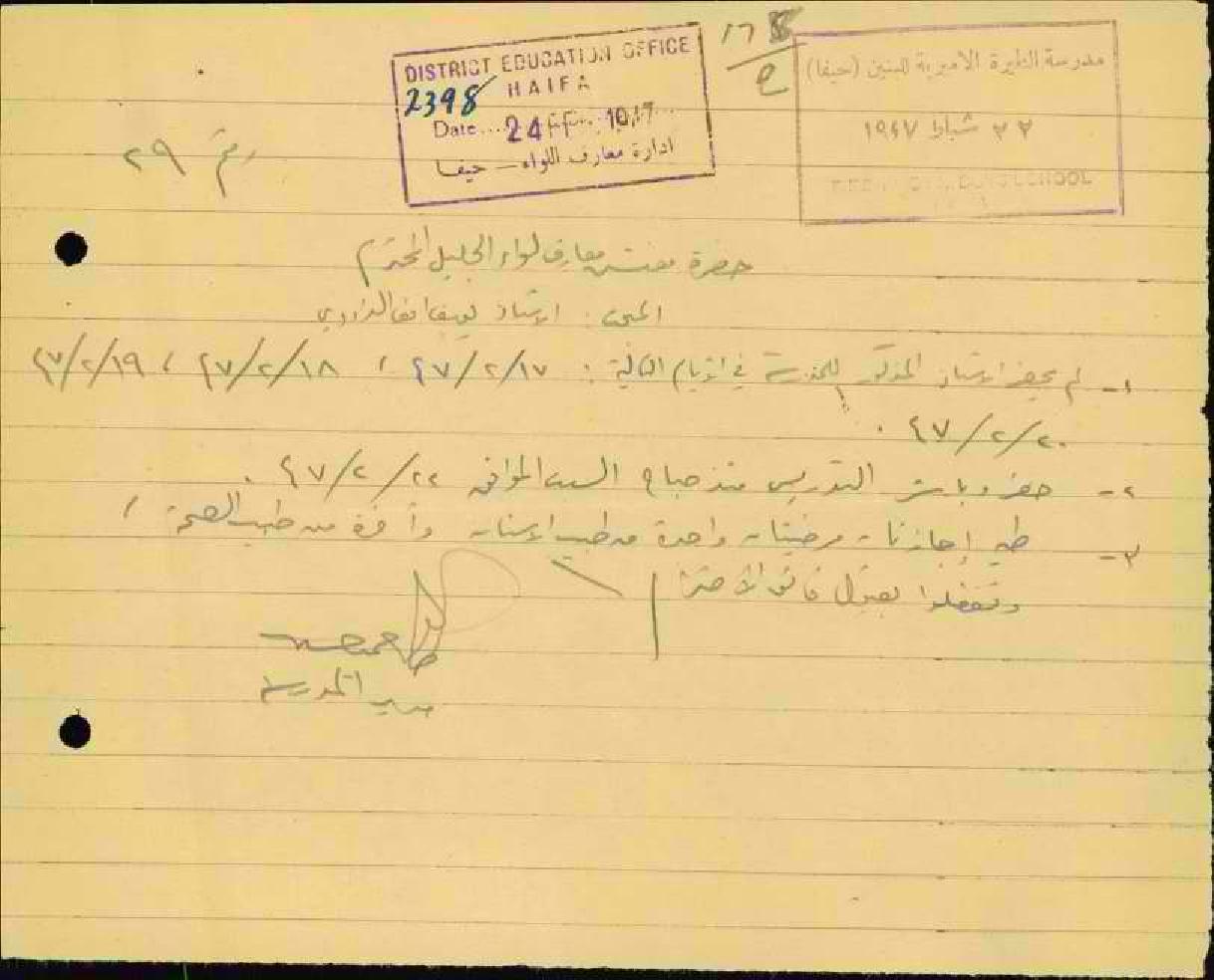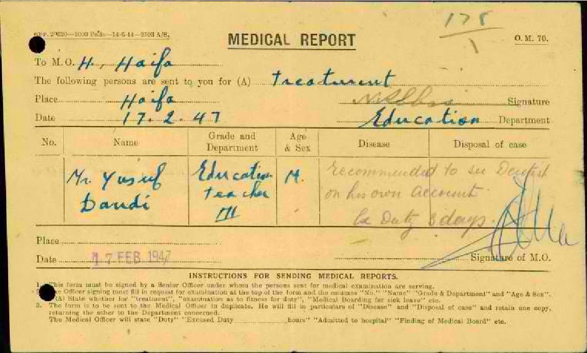 رسالة من مدير مدرسة الطيرة الى مفتش المعارف بخصوص تغيب المعلم يوسف الداودي مرفقة بالتقارير الطبي وعودته الى العمل