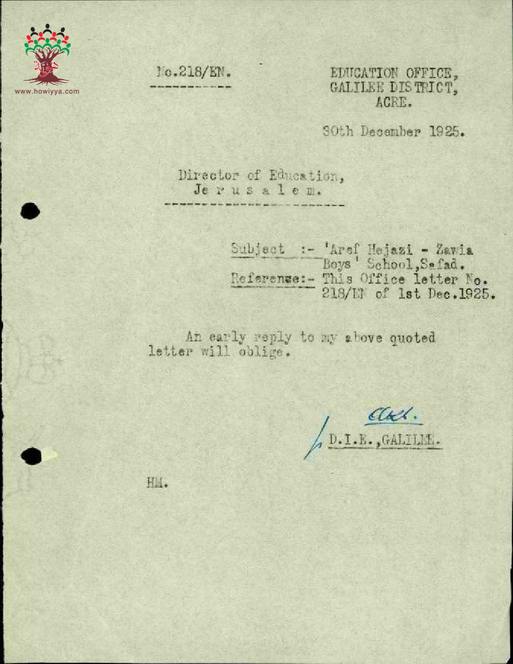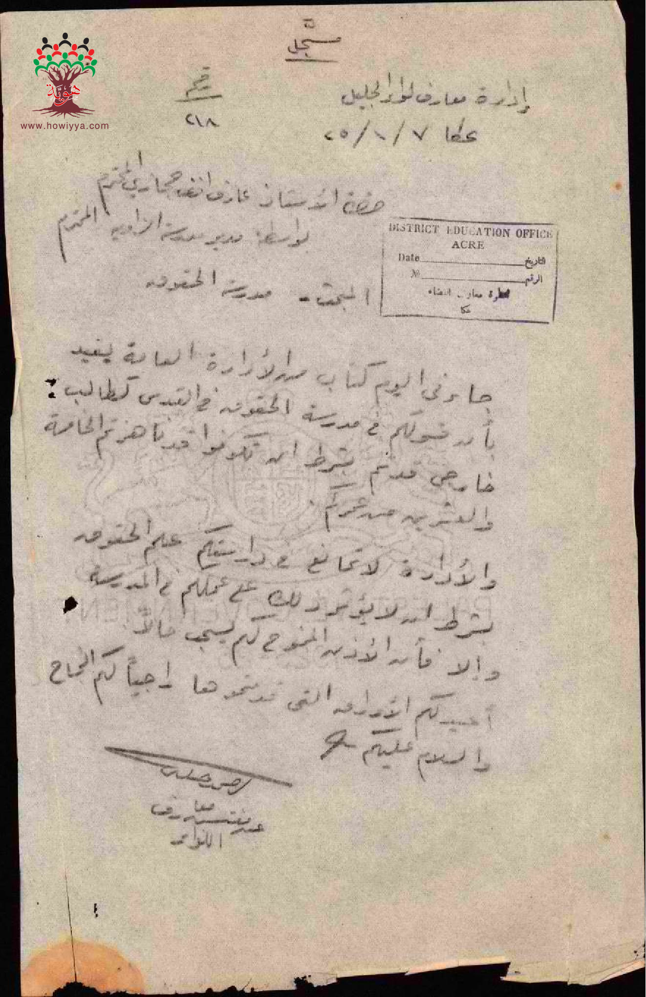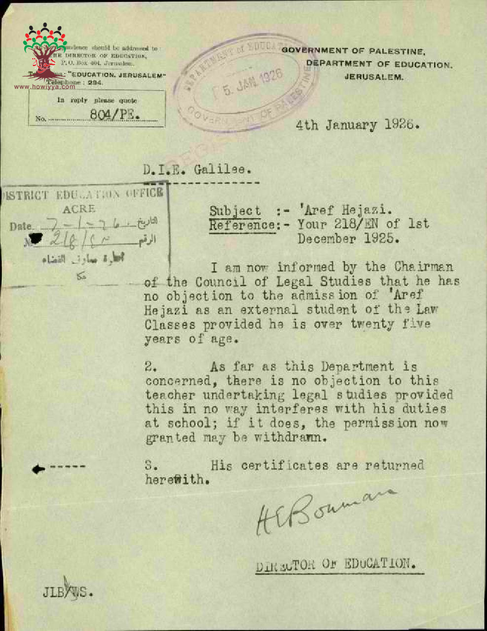 موافقة ادارة المعارف على دراسة الحقوق للمعلم حجازي - صفد