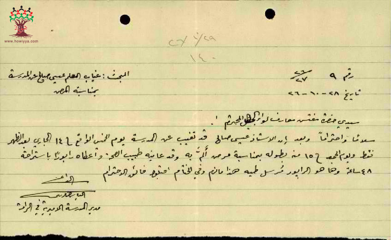 رسالة من مدير مدرسة الرامة الى مفتش المعارف بخصوص تغيب المعلم عيسى عاقلة