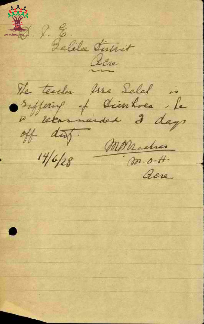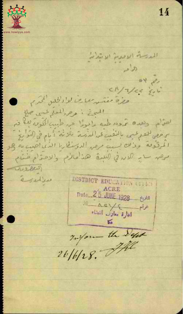 رسالة من مدير مدرسة الرامة الى مفتش المعارف بخصوص تغيب المعلم عيسى عاقلة مرفقة بالتقرير الطبي