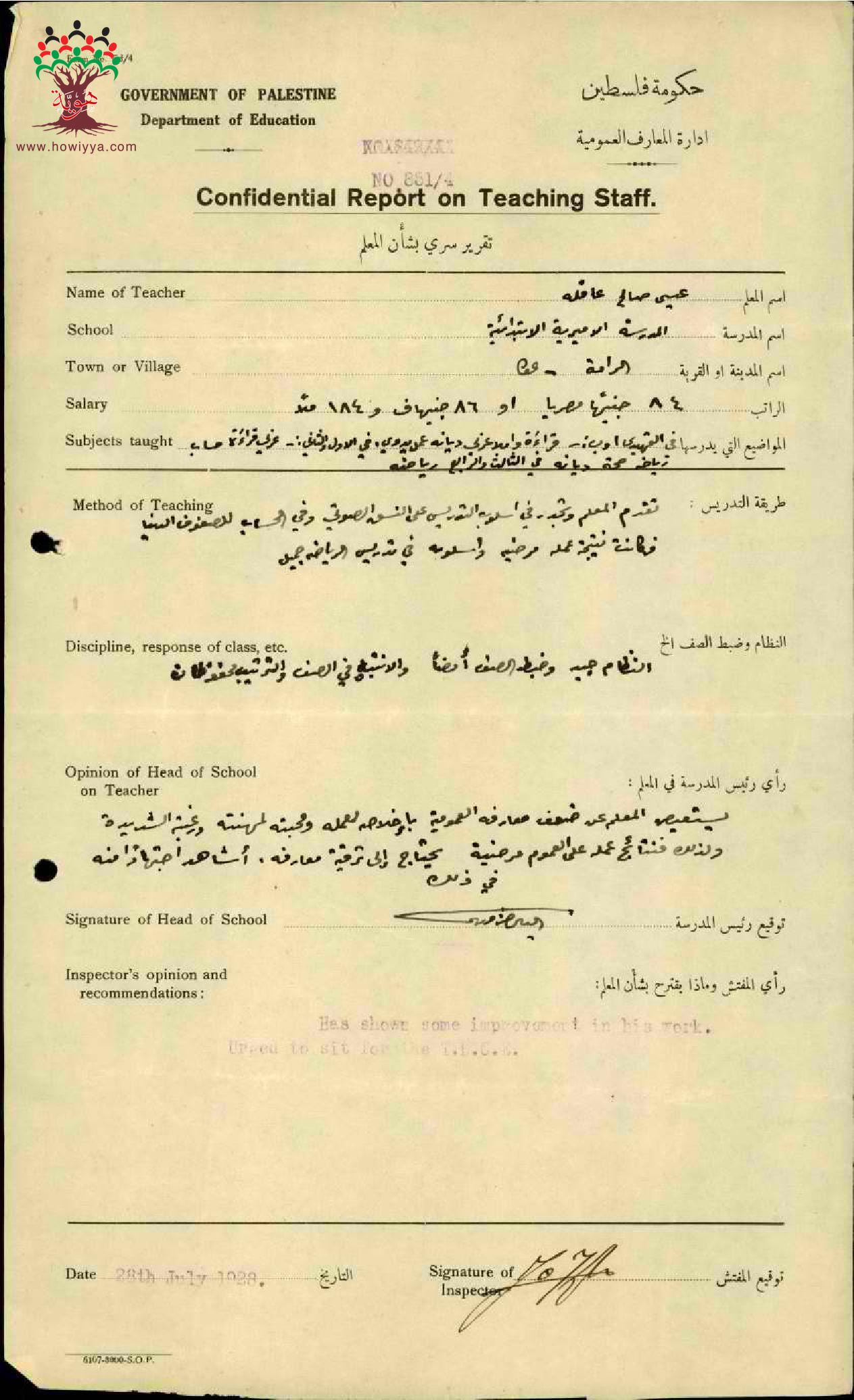 تقرير تفصيلي عن أداء المعلم عيسى صالح عاقلة في مدرسة الرامة سنة 1928