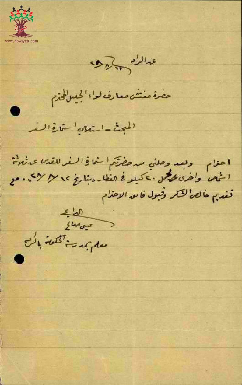 رسالة من المعلم عيسى عاقلة الى مفتش المعارف يخبره بأنه قد تسلم استمارة سفره