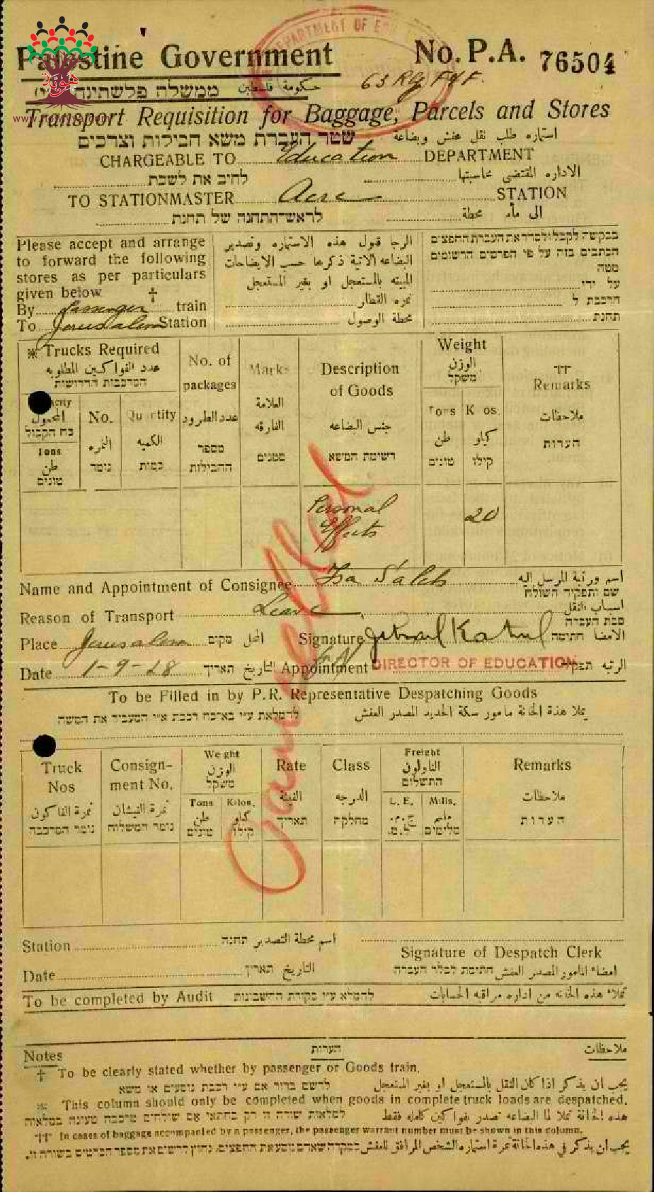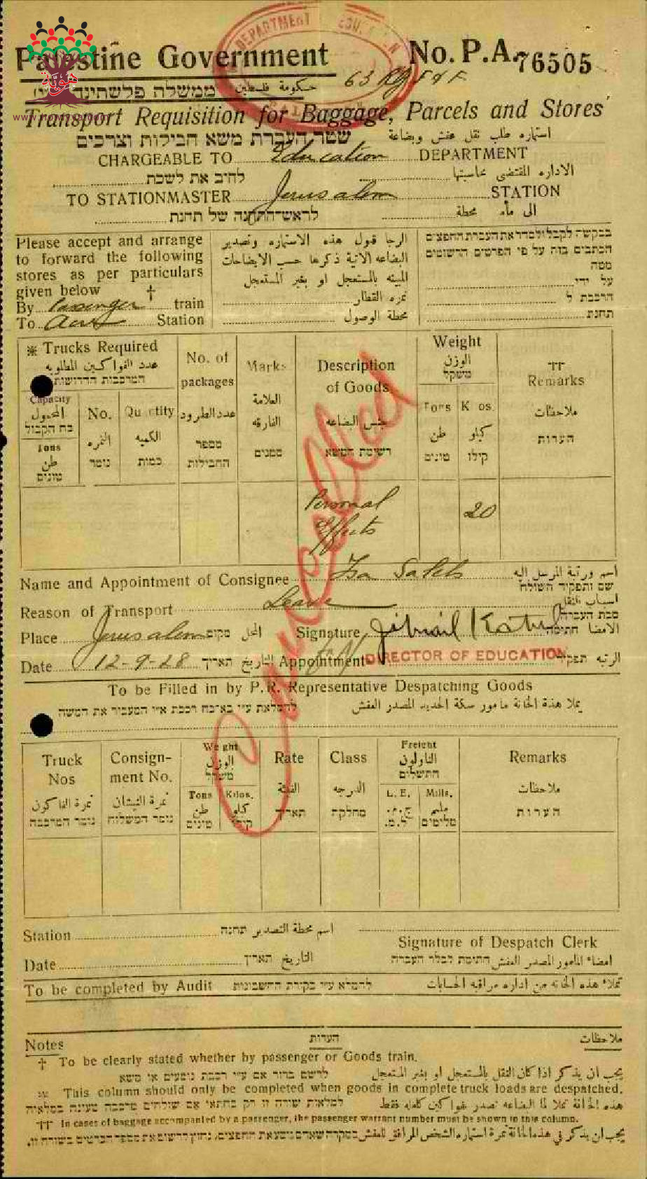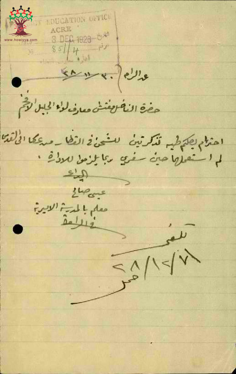 رسالة من المعلم عيسى عاقلة الى مفتش المعارف مرفقة بتذكرتين سفر ملغيتين لأنه لم يستخدمهما