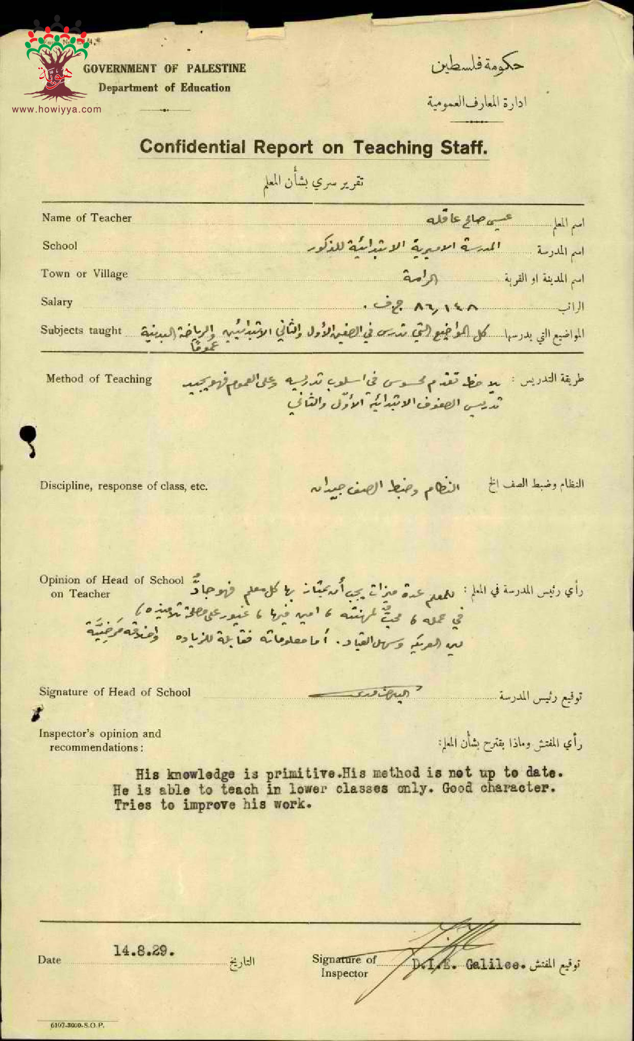 تقرير تفصيلي عن أداء المعلم عيسى صالح عاقلة في مدرسة الرامة سنة 1929