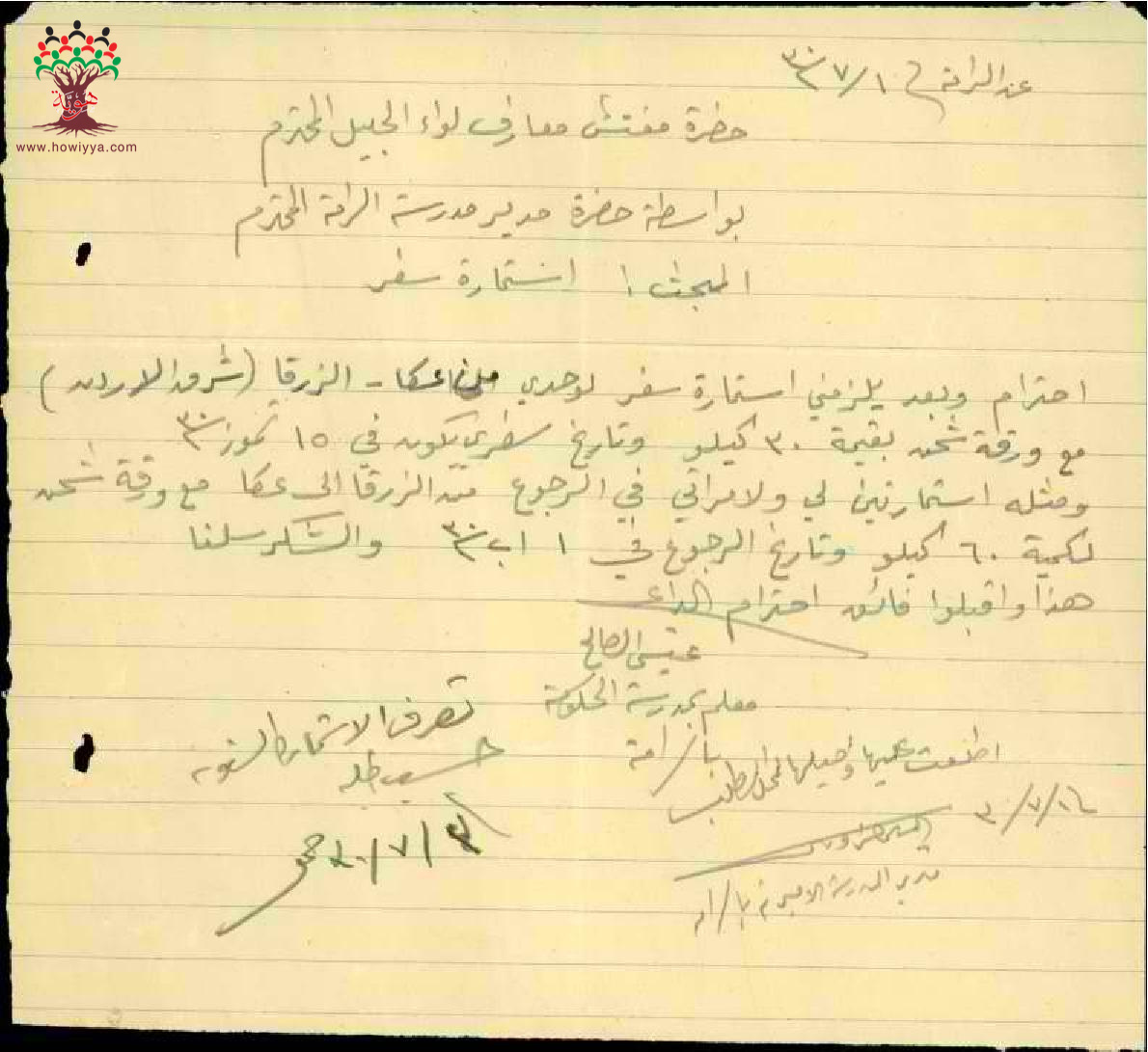 رسالة من المعلم عيسى عاقلة الى مفتش المعارف يخبره بأنه قد تسلم استمارة سفره