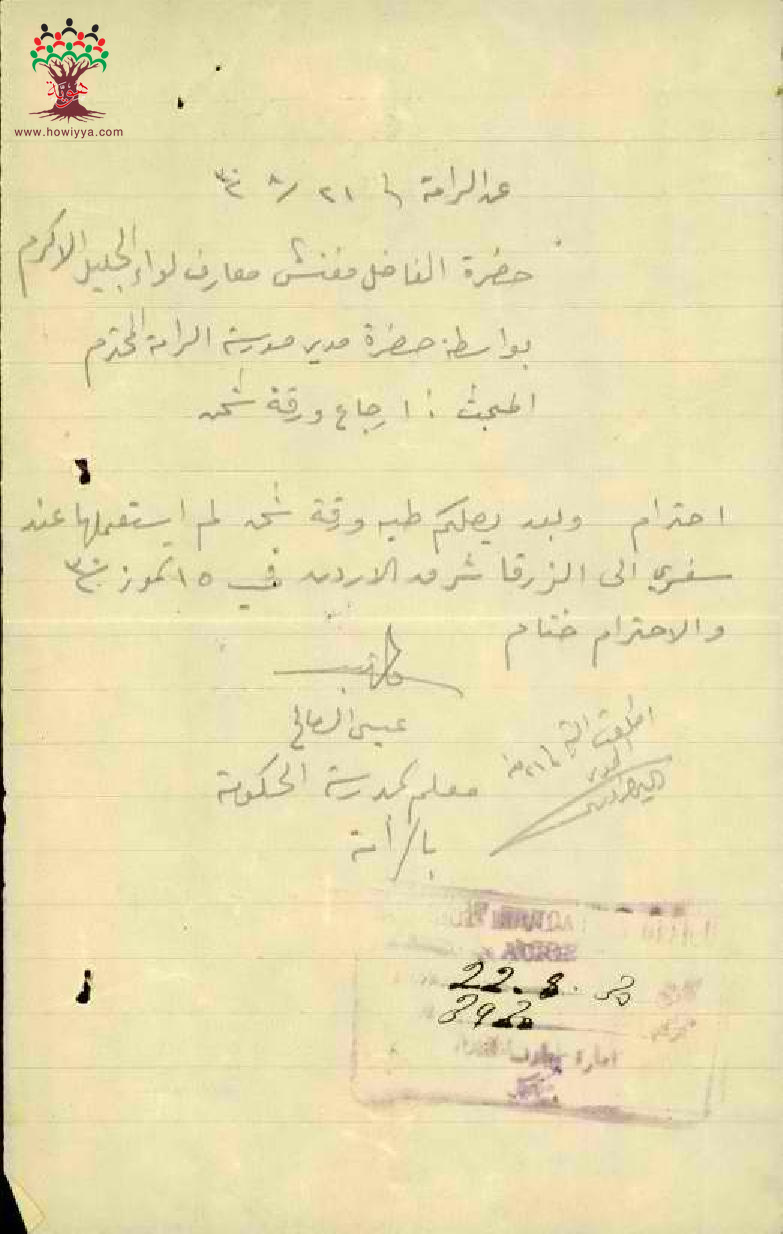 رسالة من المعلم عيسى عاقلة الى مفتش المعارف لارجاع استمارة سفر