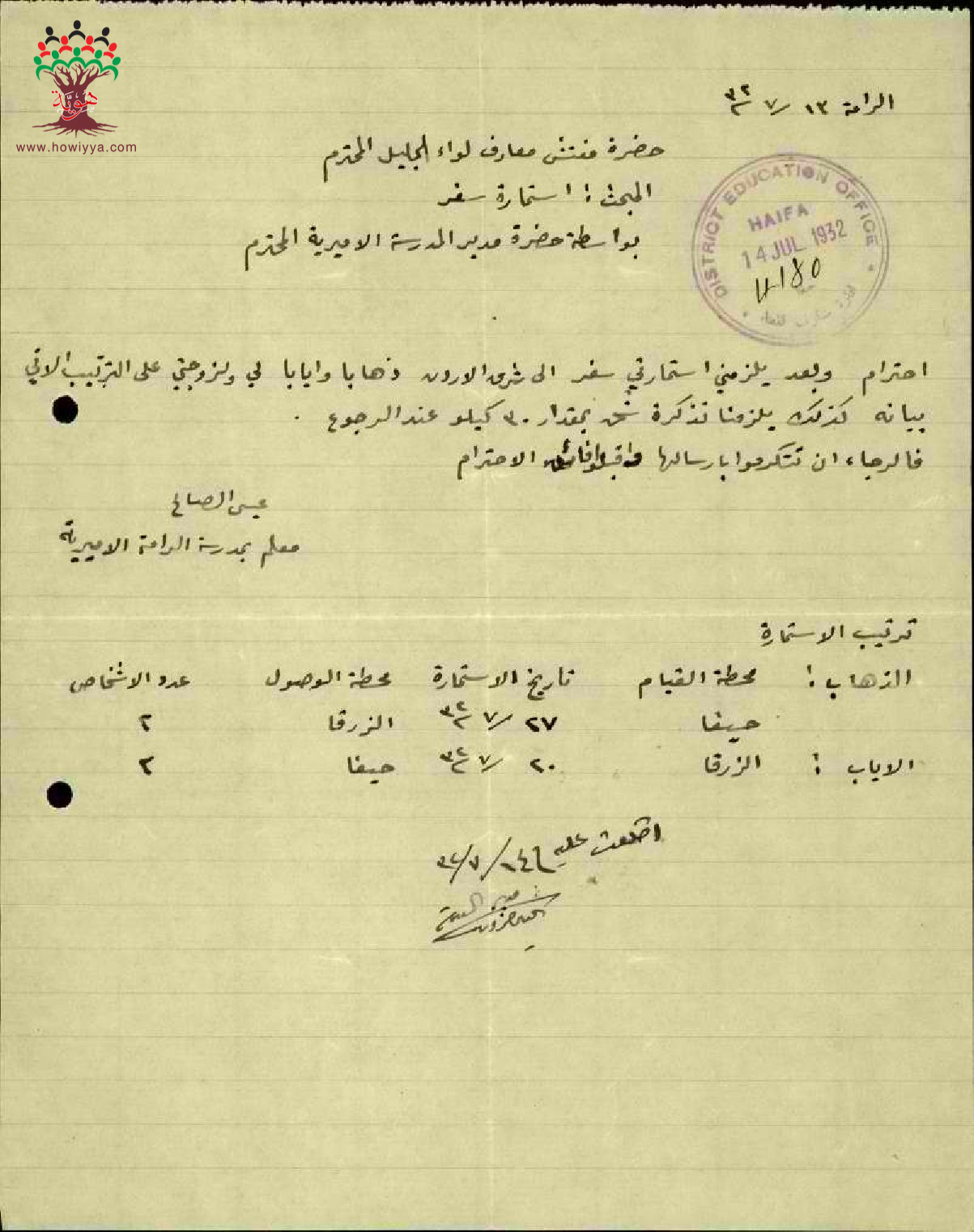 رسالة من المعلم عيسى عاقلة الى مفتش المعارف يطلب فيها استمارة سفره