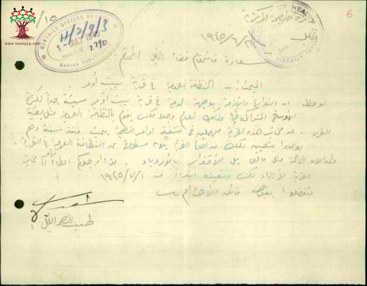 رسالة من طبيب الصحة إلى قائمقام الخليل يبحث النظافة العامة في قرية بيت امر