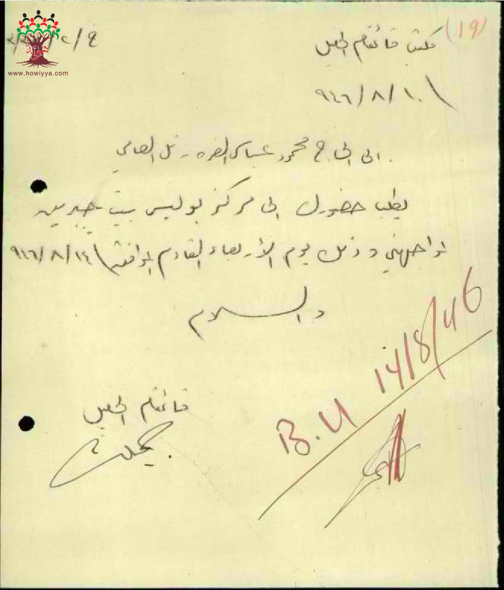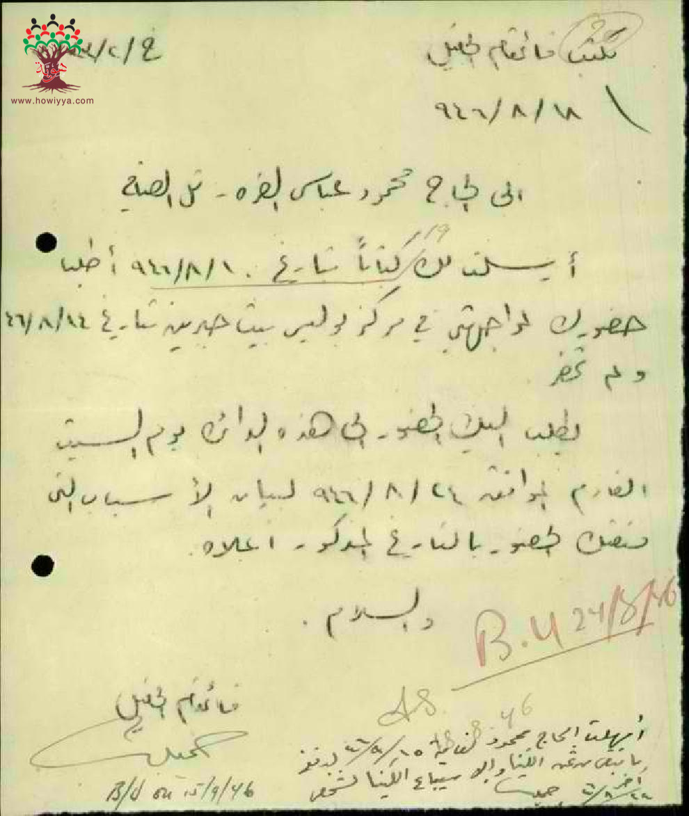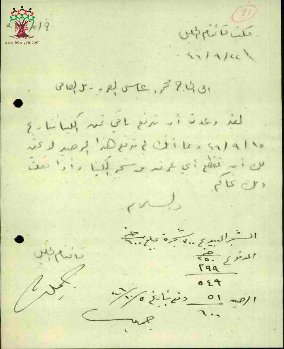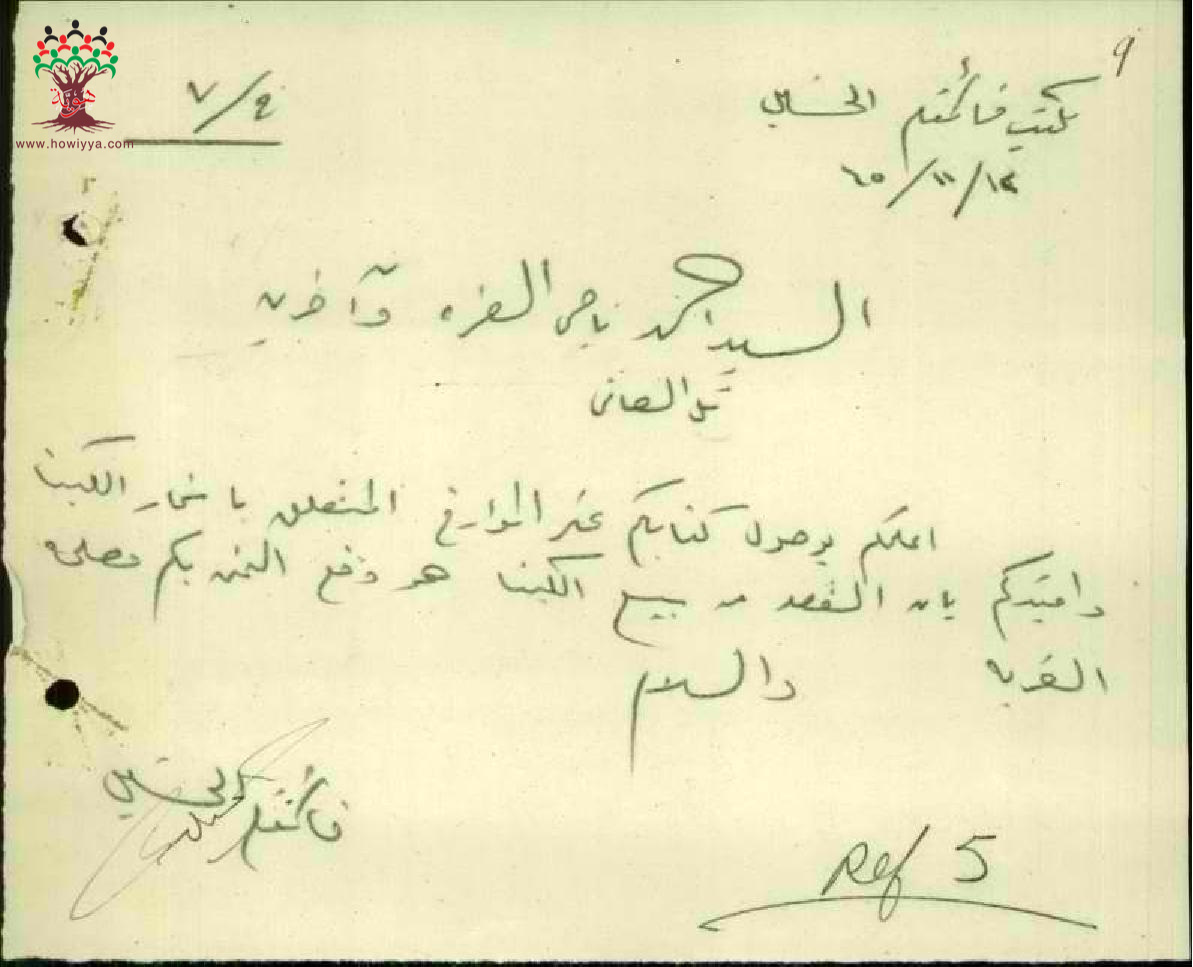 رسائل من قائمقام الخليل إلى الحاج محمود عباس الغرة بخصوص دفع ثمن شجر الكينيا