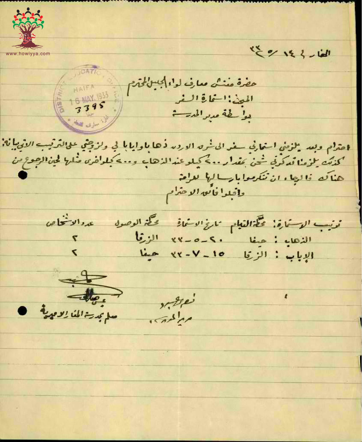 رسالة من المعلم عيسى عاقلة الى مفتش المعارف يطلب فيها استمارة سفره