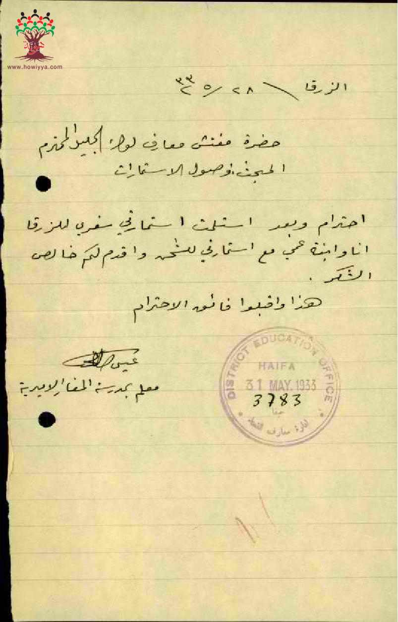 رسالة من المعلم عيسى عاقلة الى مفتش المعارف يخبره بأنه قد تسلم استمارة سفره