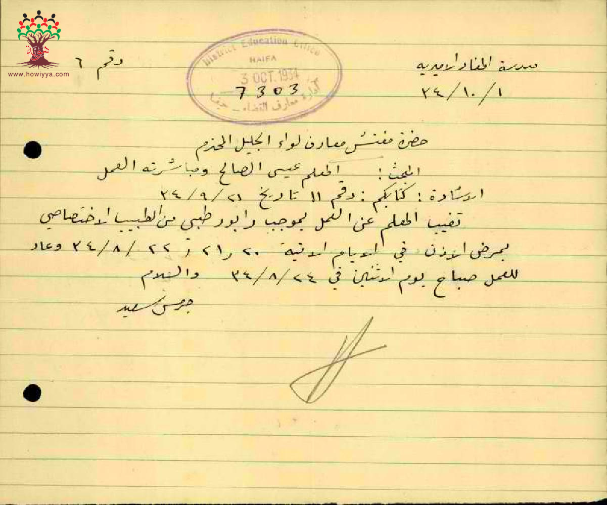 رسالة من مدير مدرسة المغار الى مفتش المعارف بخصوص تغيب المعلم عيسى عاقلة مرفقة بالتقرير الطبي