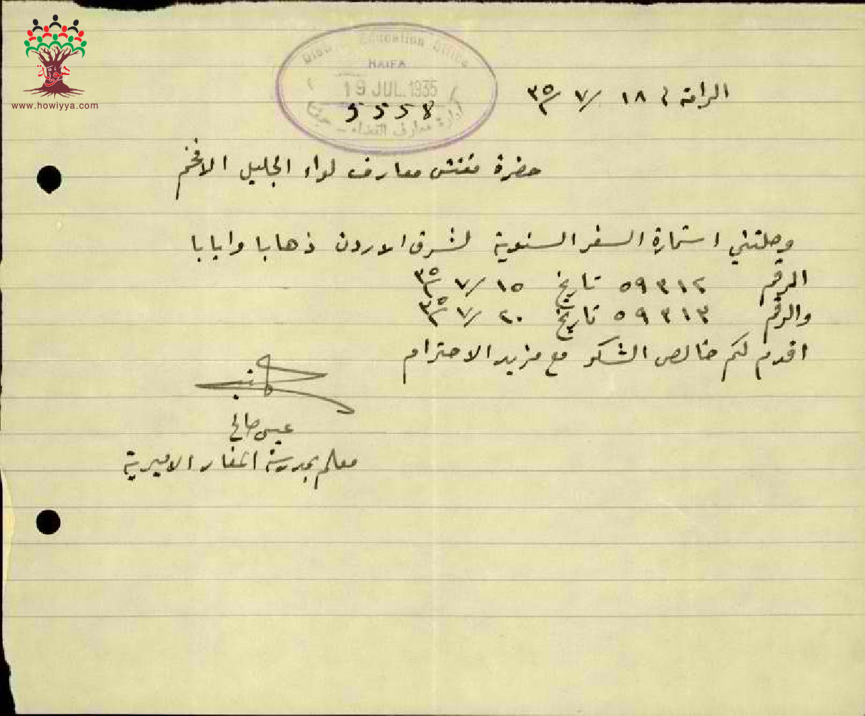 رسالة من المعلم عيسى عاقلة الى مفتش المعارف يخبره بأنه قد تسلم استمارة سفره