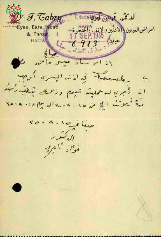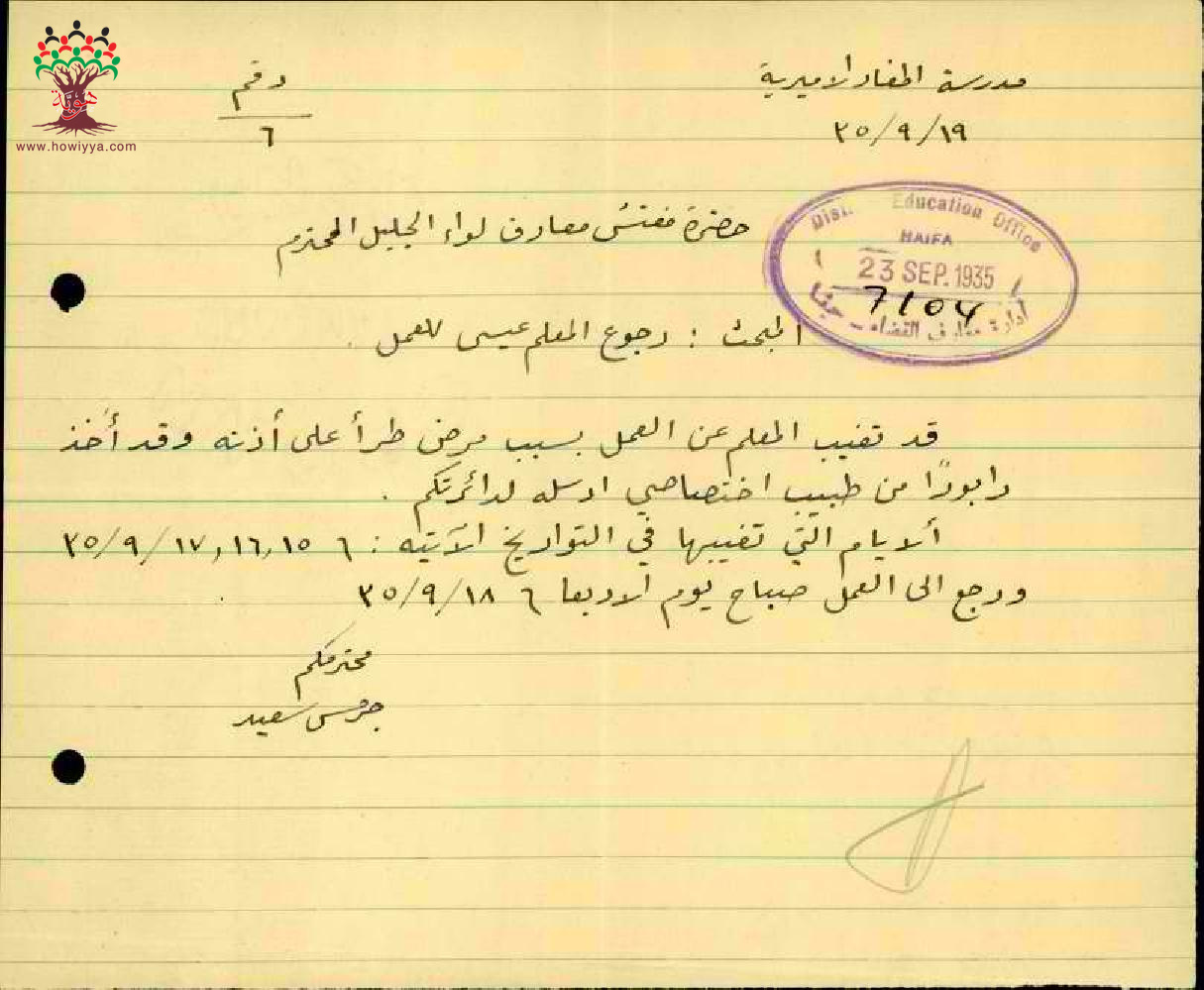 رسالة من مدير مدرسة المغار الى مفتش المعارف بخصوص تغيب المعلم عيسى عاقلة مرفقة بالتقرير الطبي
