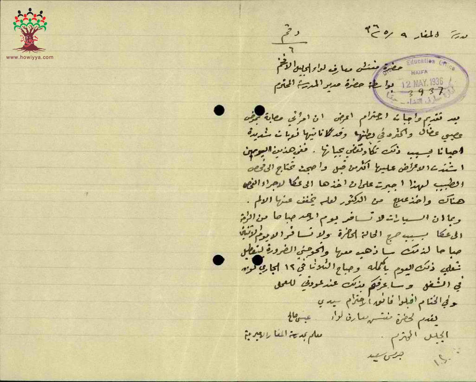 رسالة من المعلم عيسى عاقلة الى مفتش المعارف يطلب الاذن بالتغيب بسبب مرض زوجته