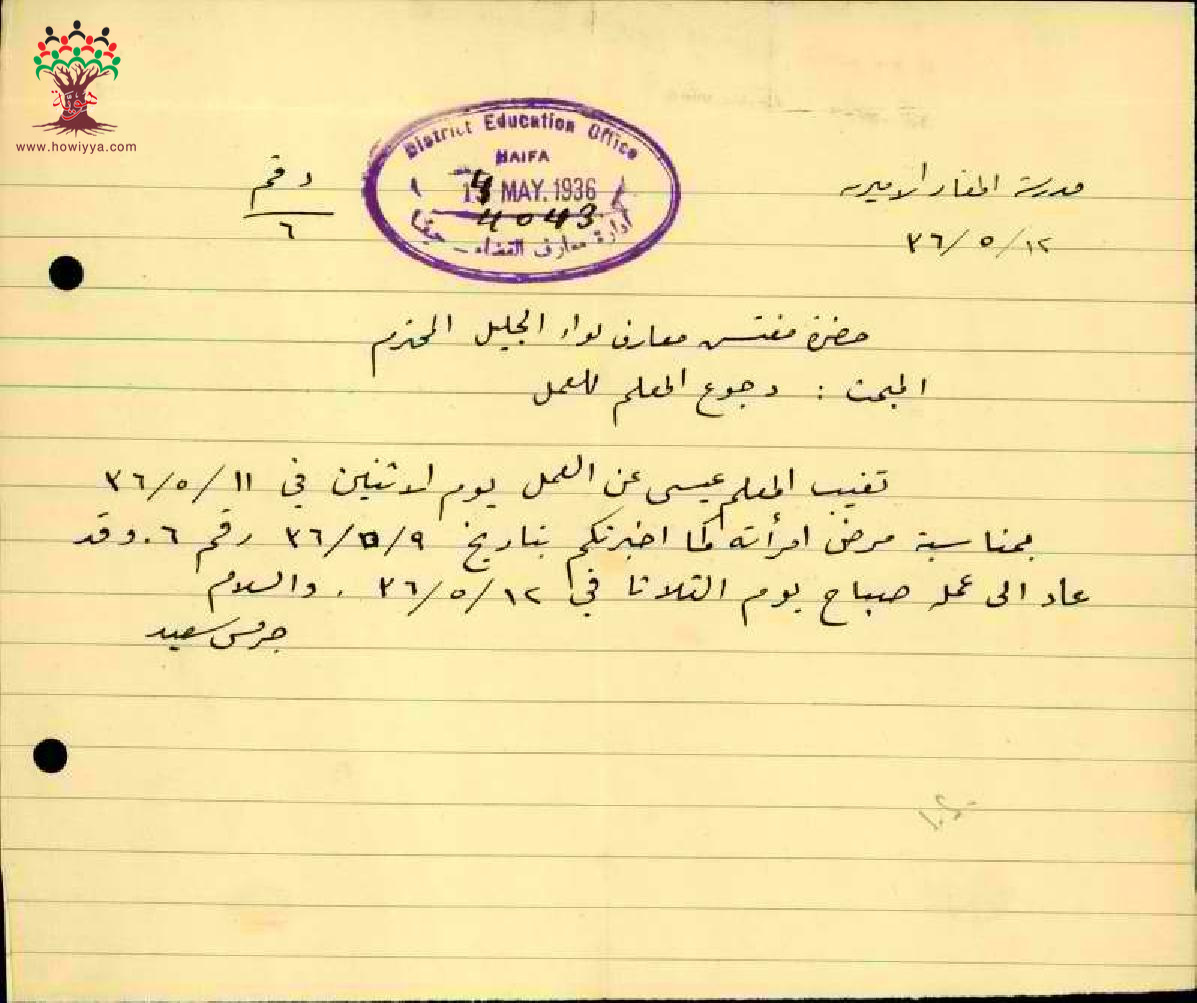 رسالة من مدير مدرسة المغار الى مفتش المعارف بخصوص تغيب المعلم عيسى عاقلة بسبب مرض زوجته