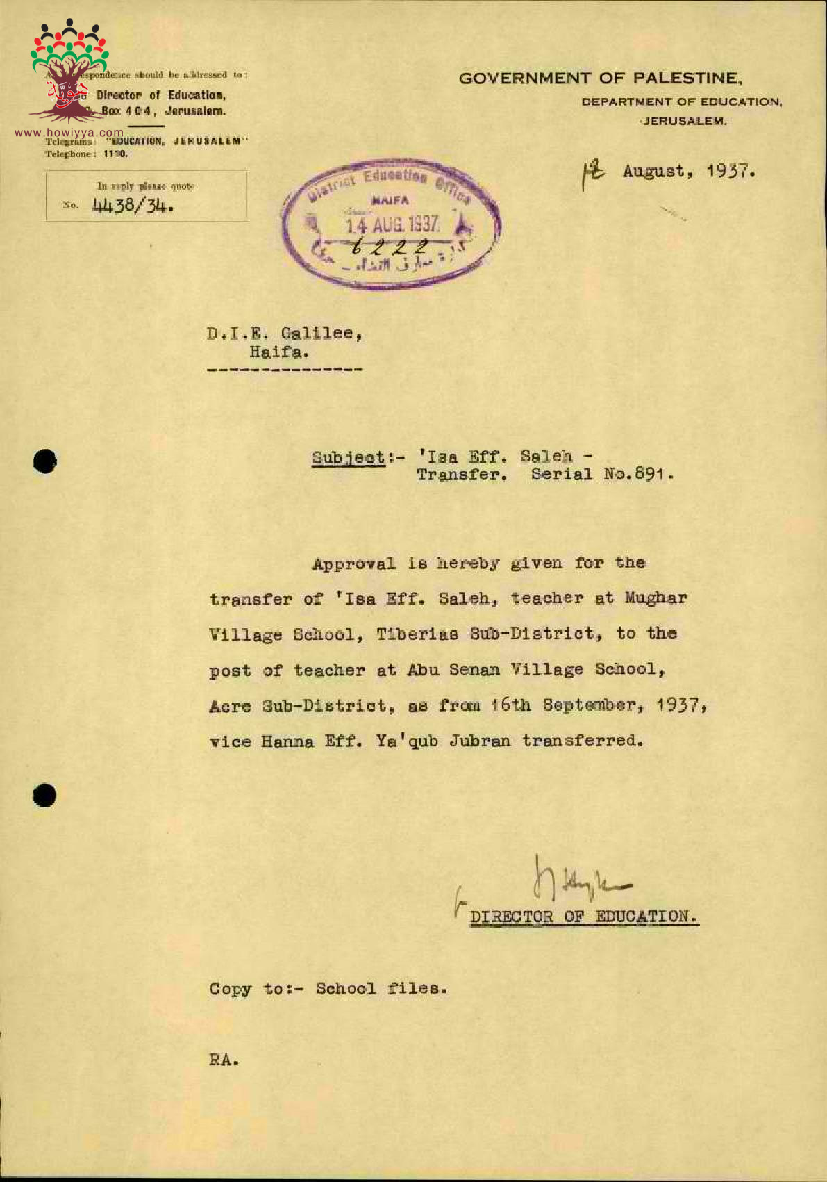 رسالة من مدير المعارف الى مفتش المعارف بخصوص الموافقة على نقل المعلم عيسى عاقلة من مدرسة المغار الى مدرسة أبو سنان