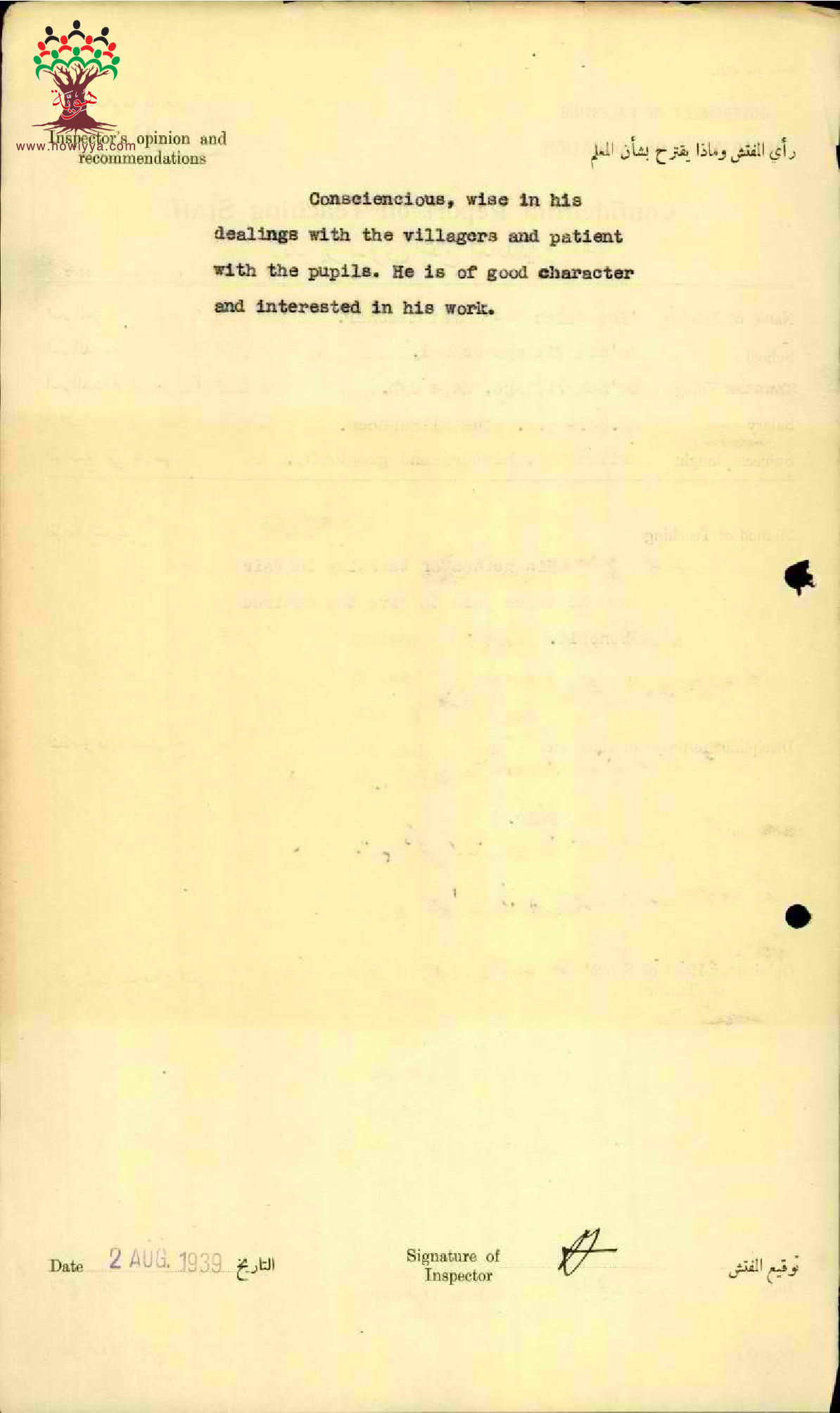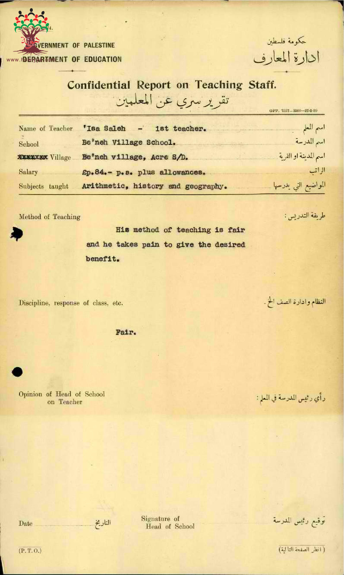 تقرير تفصيلي عن أداء المعلم عيسى صالح عاقلة في مدرسة البعنة سنة 1939