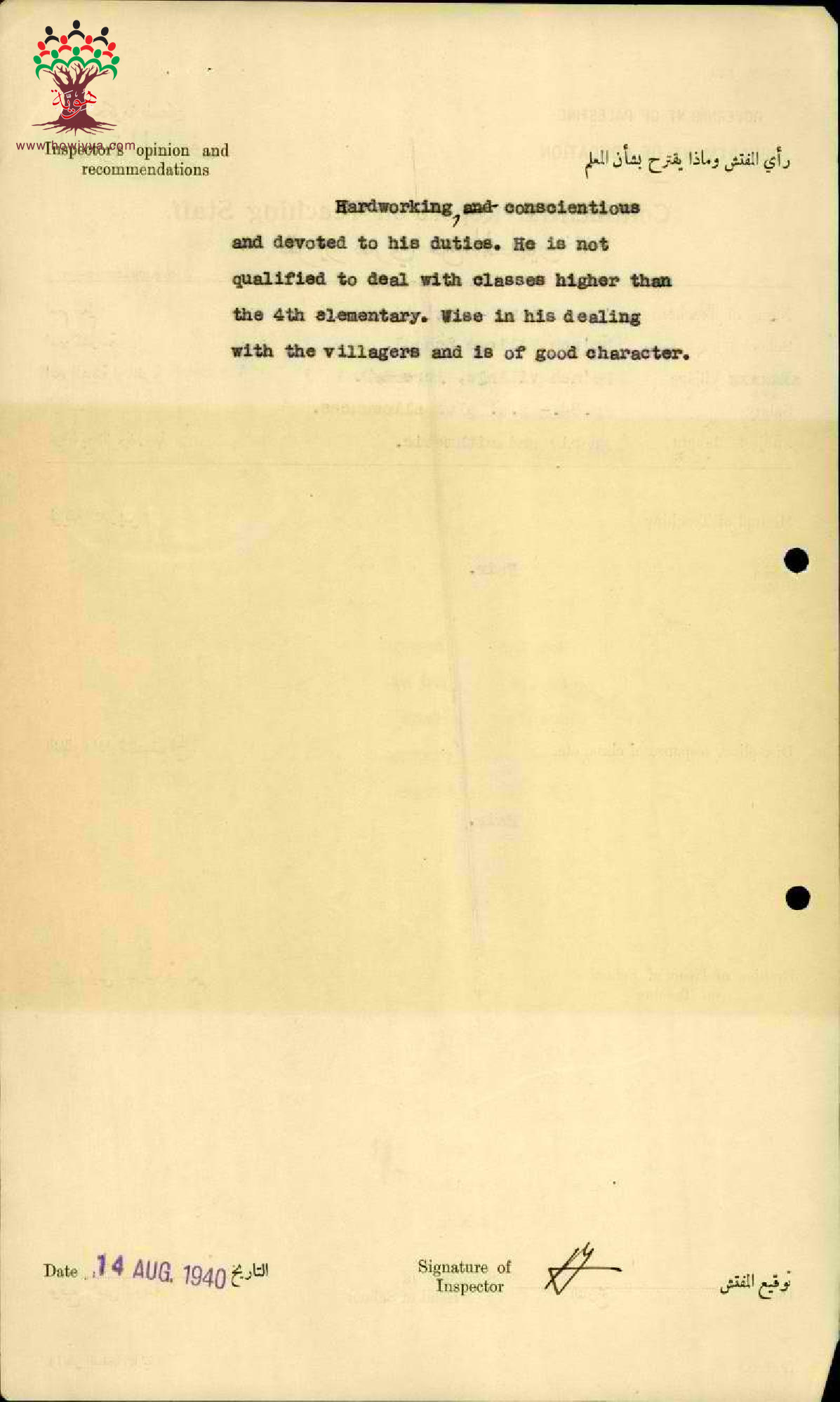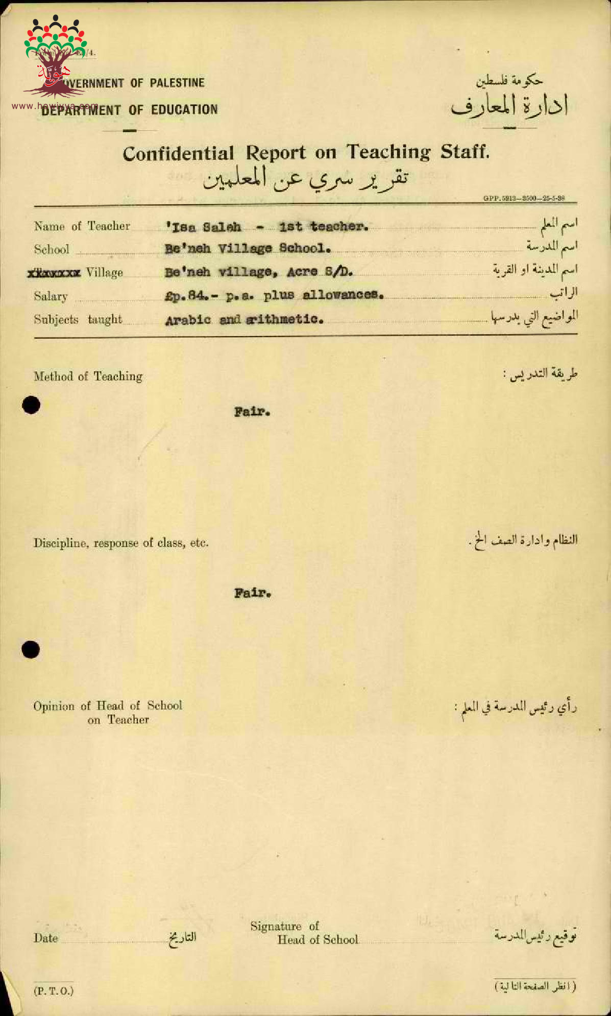 تقرير تفصيلي عن أداء المعلم عيسى صالح عاقلة في مدرسة البعنة سنة 1940