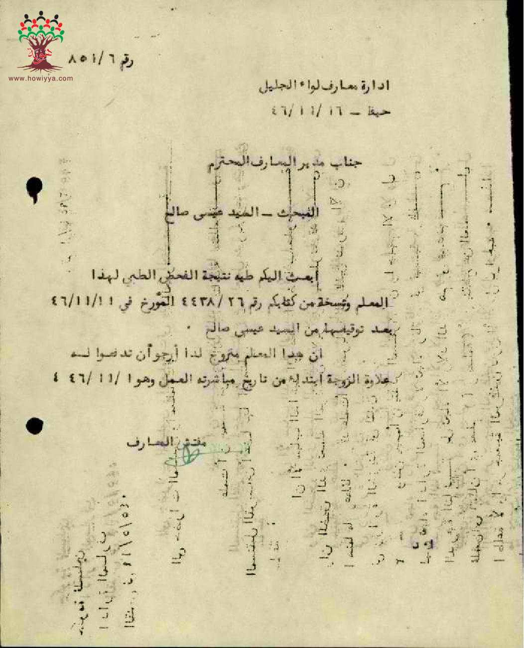 رسالة من مفتش المعارف الى مدير المعارف بخصوص التقرير الطبي لتعيين المعلم عيسى عاقلة