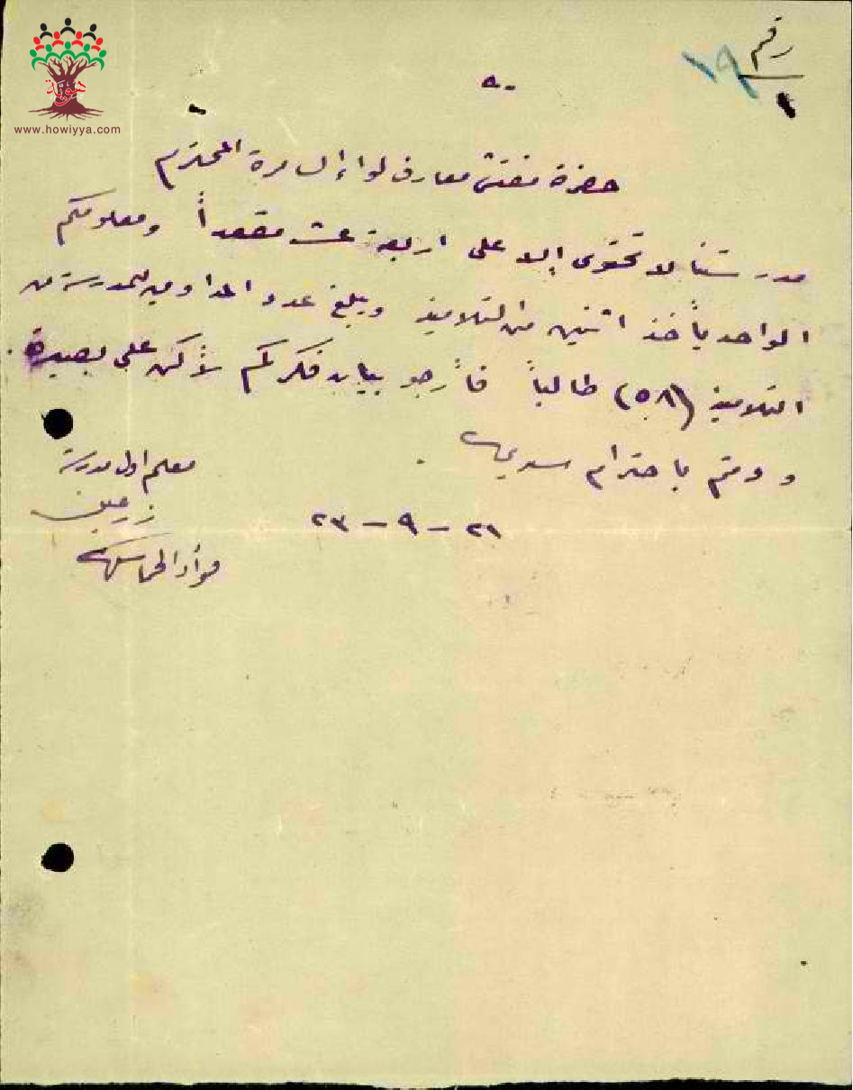 رسالة من المعلم فؤاد الخماش الى مفتش المعارف بخصوص عدم كفاية عدد المقاعد للتلاميذ