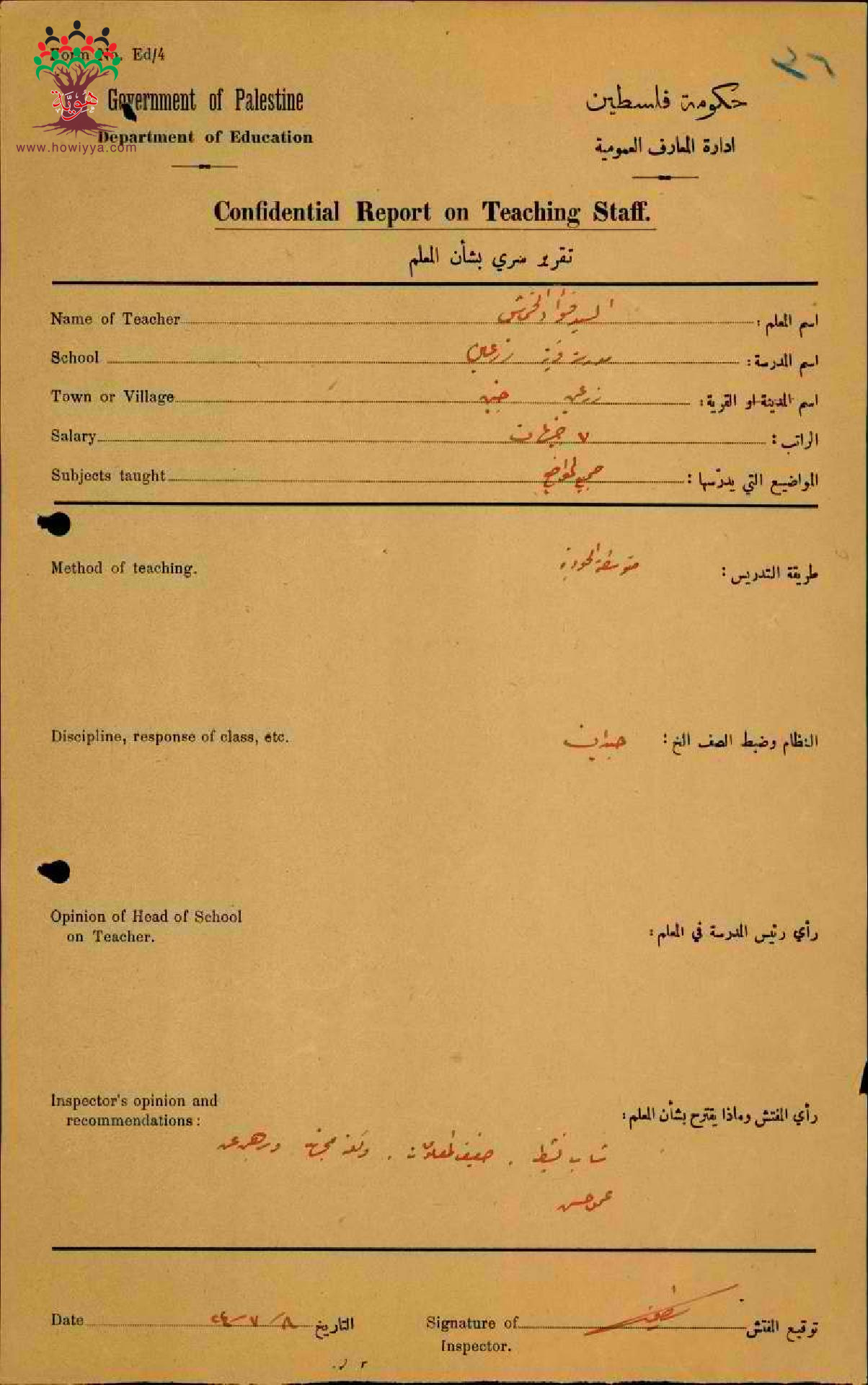 تقرير تفصيلي عن أداء المعلم فؤاد خماش في مدرسة زرعين سنة 1924