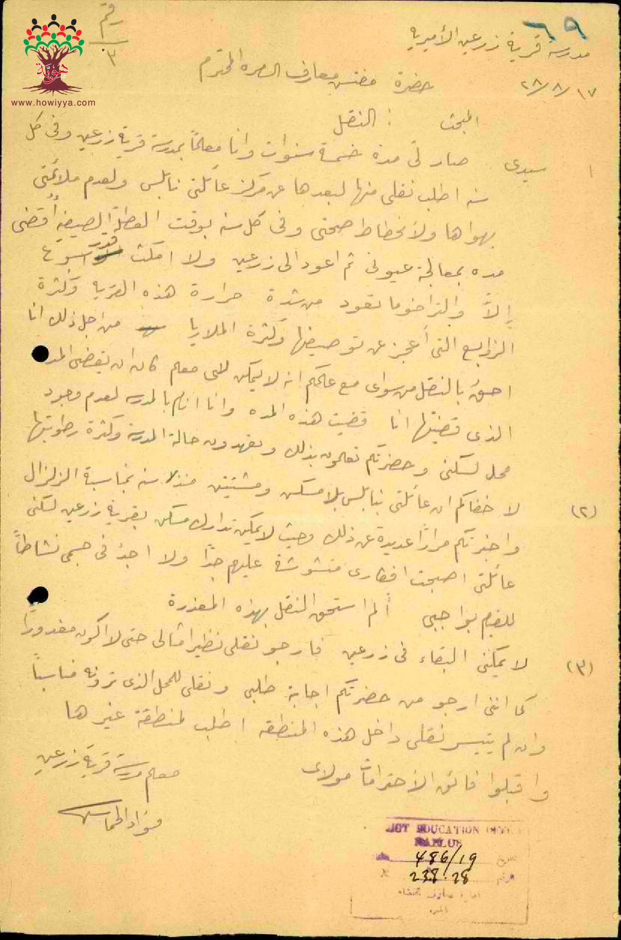 رسالة من المعلم فؤاد خماش الى مفتش المعارف يطلب فيها نقله من مدرسة زرعين الى نابلس