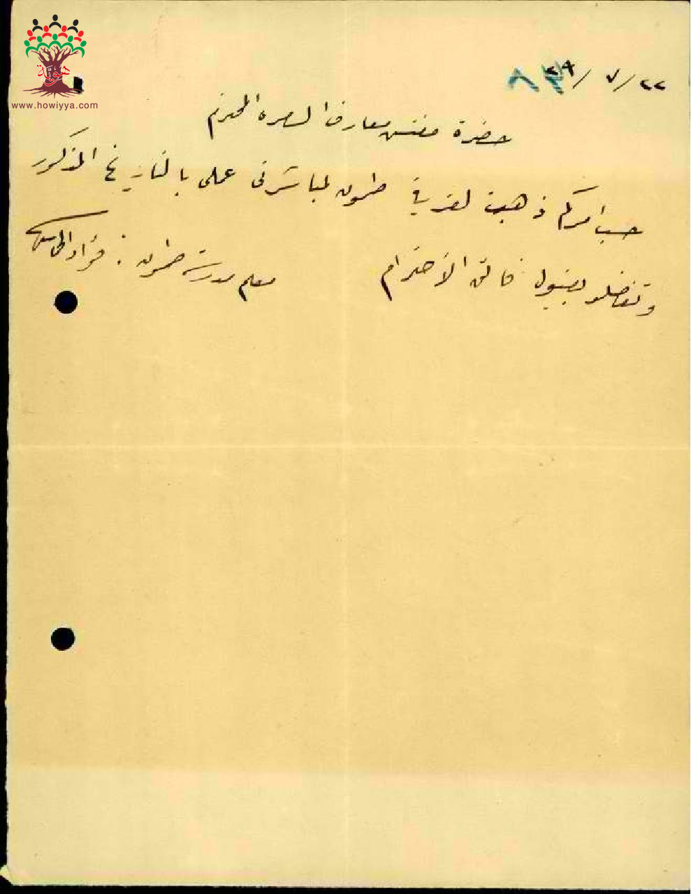 رسالة من المعلم فؤاد خماش الى مفتش المعارف يخبره بأنه قد باشر عمل في قرية طمون