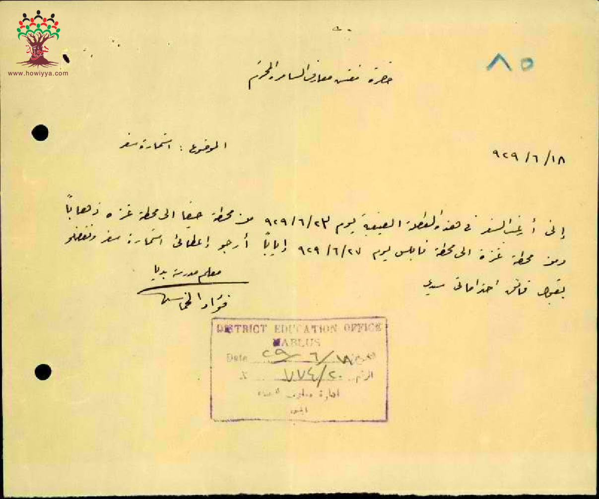 رسالة من المعلم فؤاد خماش الى مفتش المعارف يطلب فيها استمارة سفره السنوية