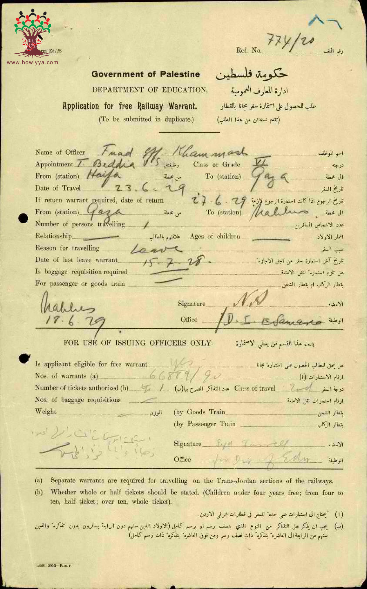 طلب استمارة سفر مقدمة من المعلم فؤاد خماش/نابلس