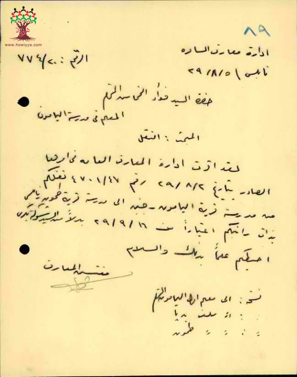 رسالة من مفتش المعارف الى المعلم فؤاد خماش بخصوص نقله من اليامون الى طمون