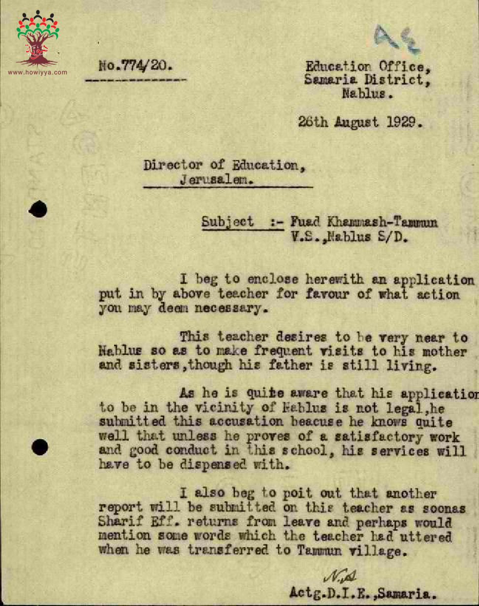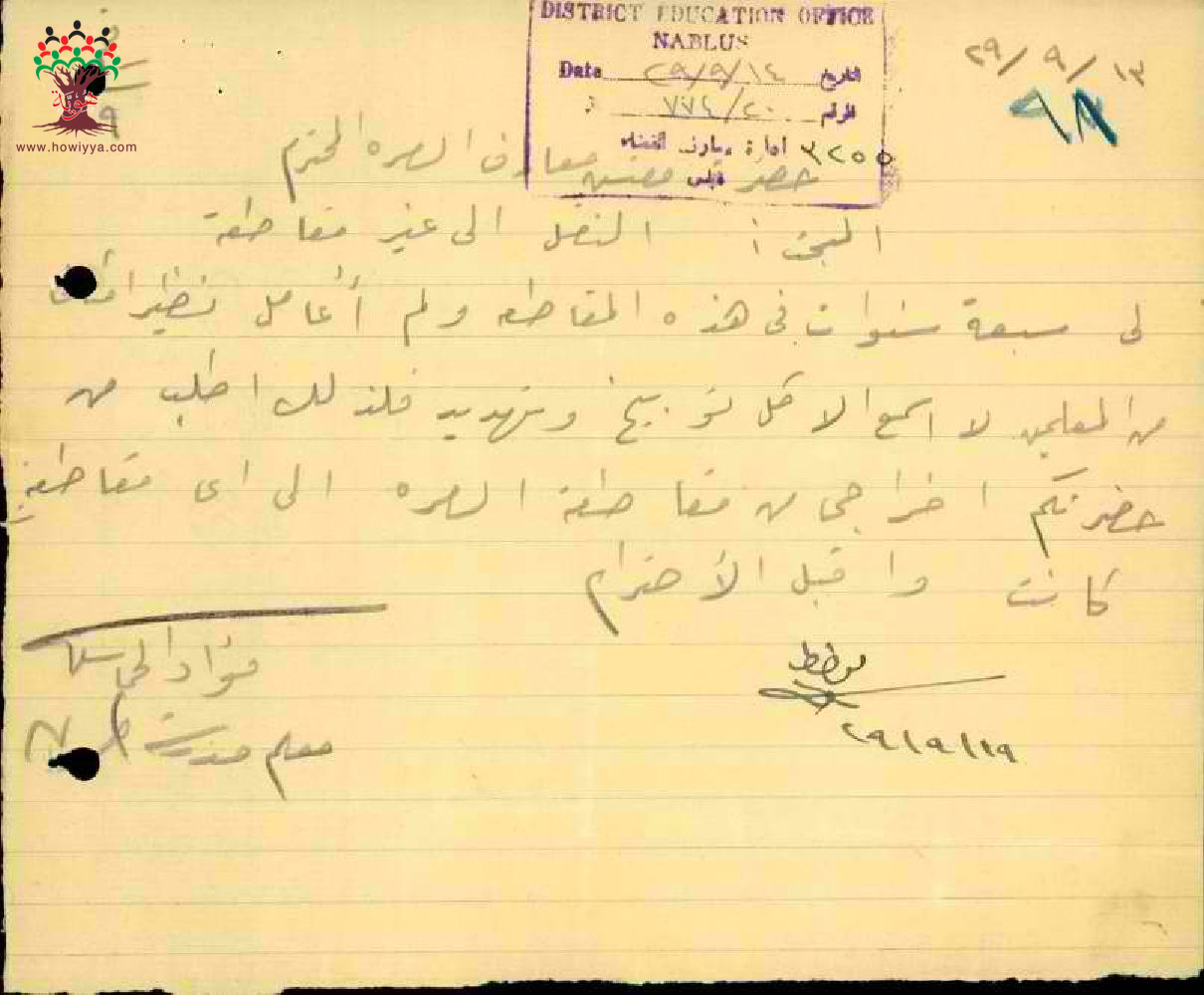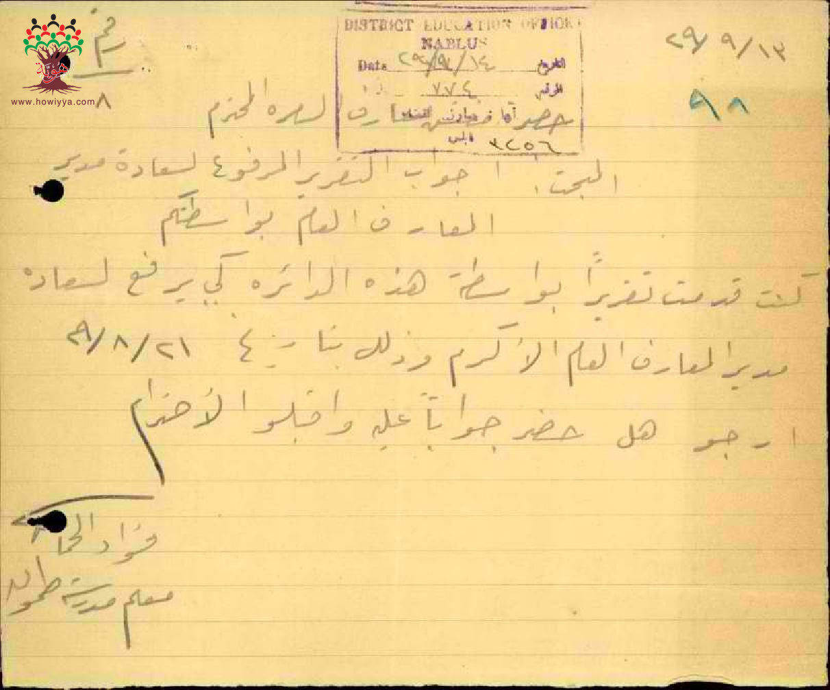 مجموعة رسائل بخصوص شكوى المعلم فؤاد خماش ضد مفتش المنطقة وطلب نقله الى نابلس