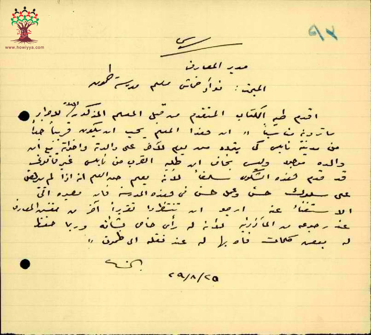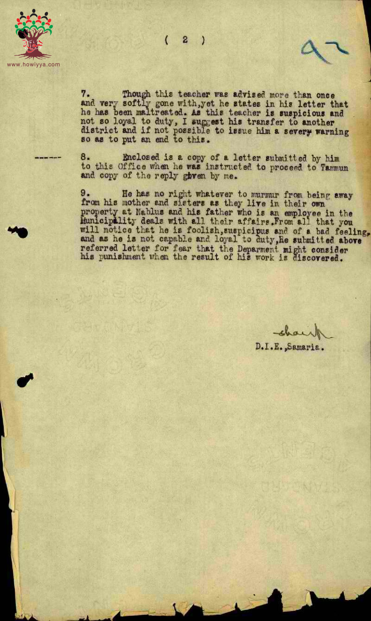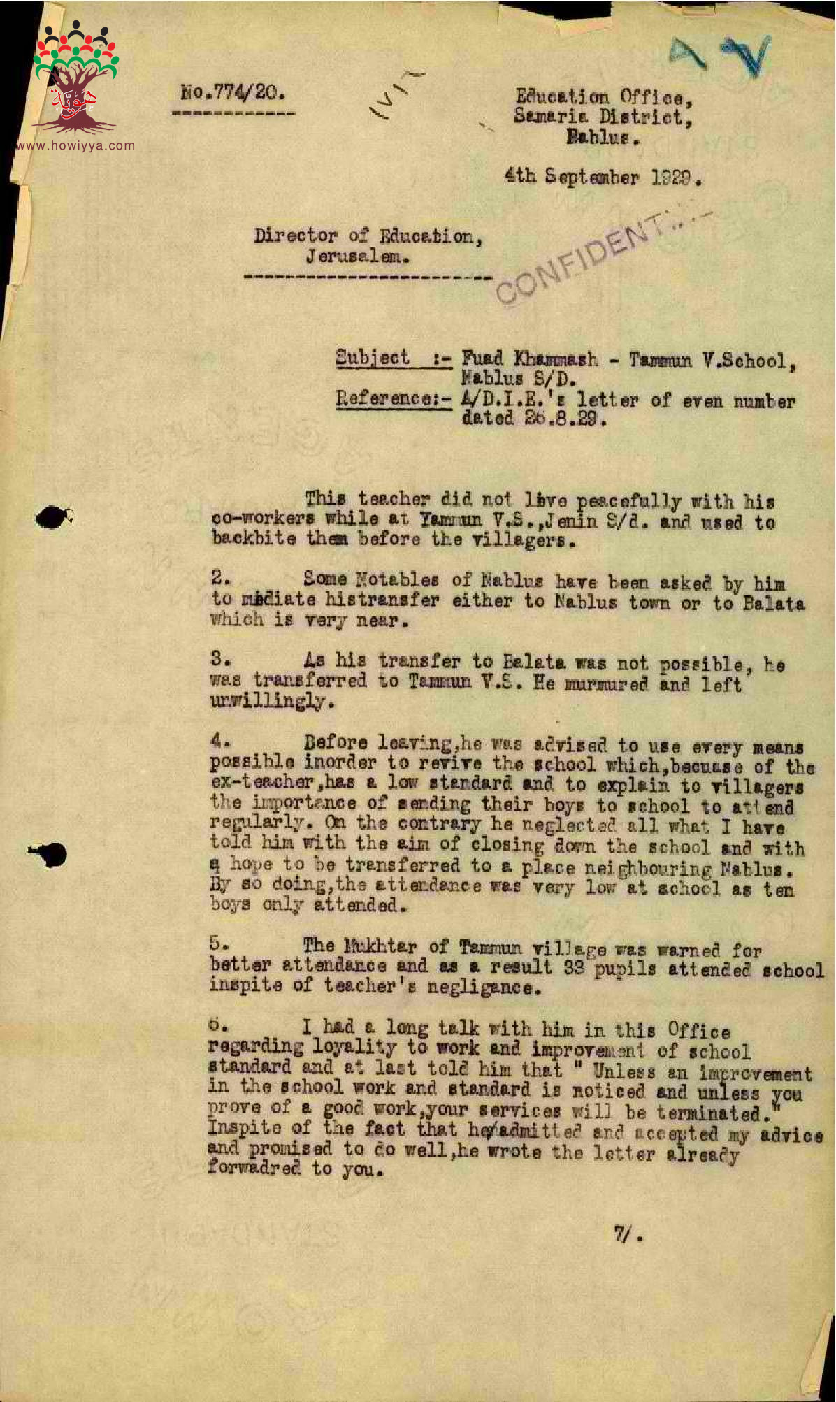 مجموعة رسائل بخصوص شكوى المعلم فؤاد خماش ضد مفتش المنطقة وطلب نقله الى نابلس