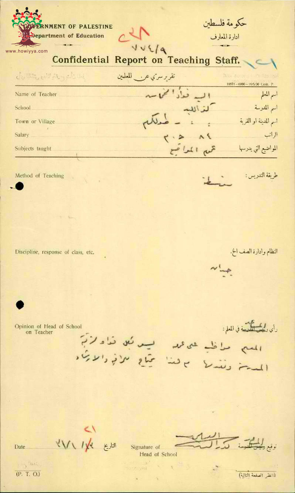 تقرير تفصيلي عن أداء المعلم فؤاد خماش في مدرسة كفر اللبد سنة 1930