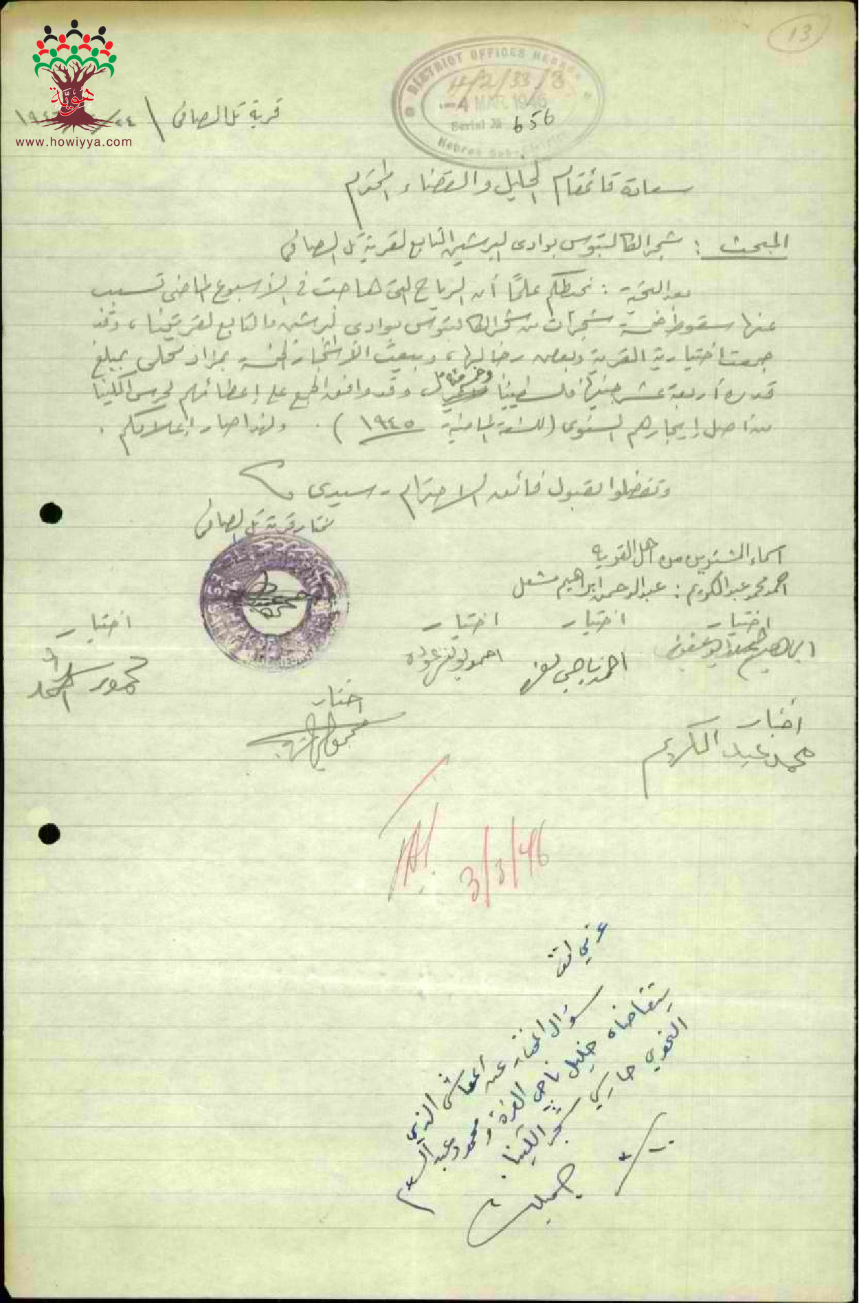 رسالة موقعة من مخاتير تل الصافي إلى قائمقام الخليل بخصوص شجر الكالبتوس في وادي البرشين