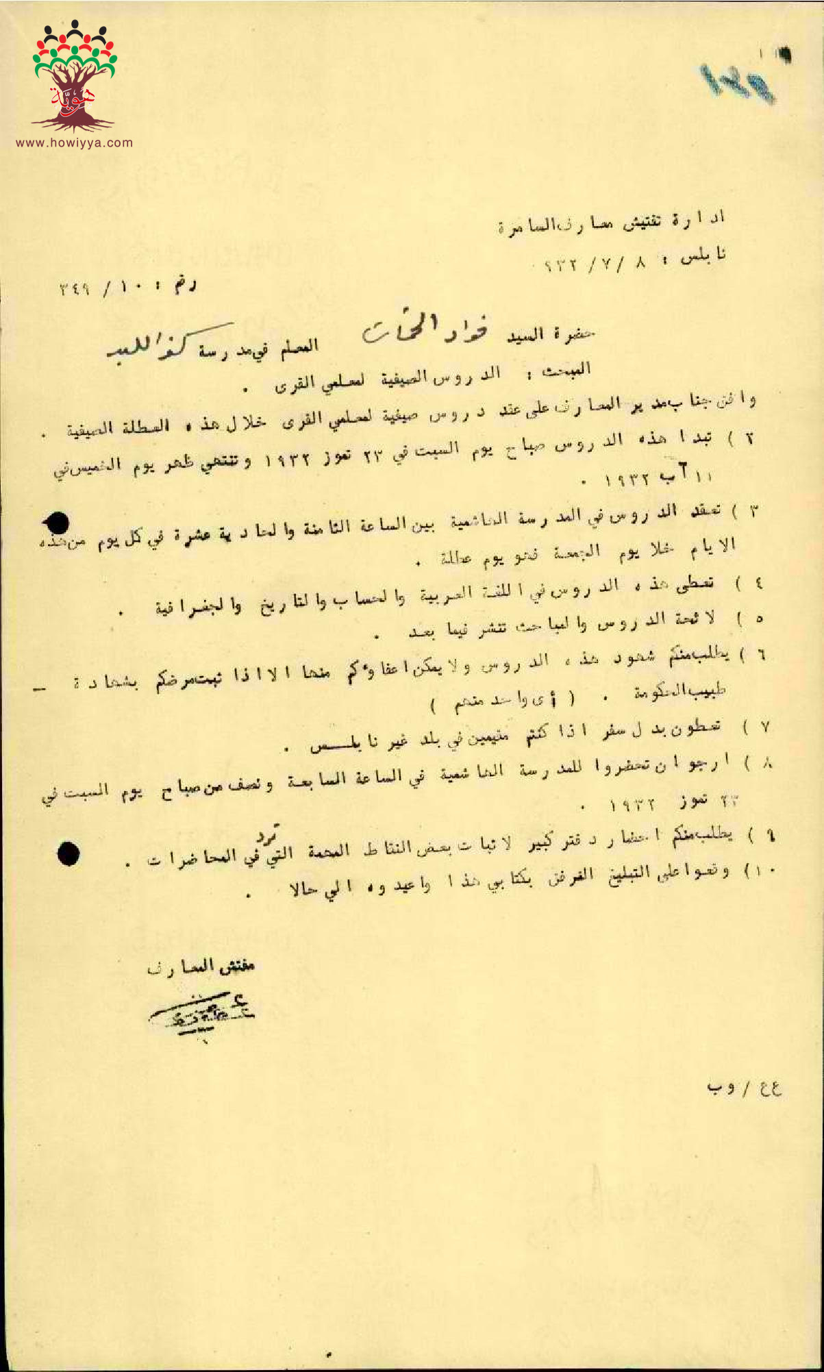 رسالة من مفتش المعارف الى المعلم فؤاد خماش بخصوص دروس المعلمين في العطلة الصيفية