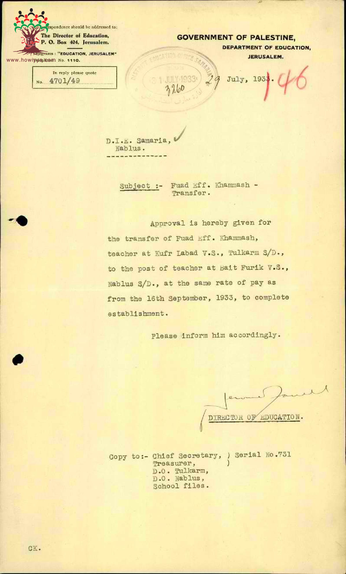 رسالة من مدير المعارف الى مفتش المعارف بخصوص نقل المعلم فؤاد خماش من مدرسة كفر اللبد الى مدرسة بيت فوريك/نابلس