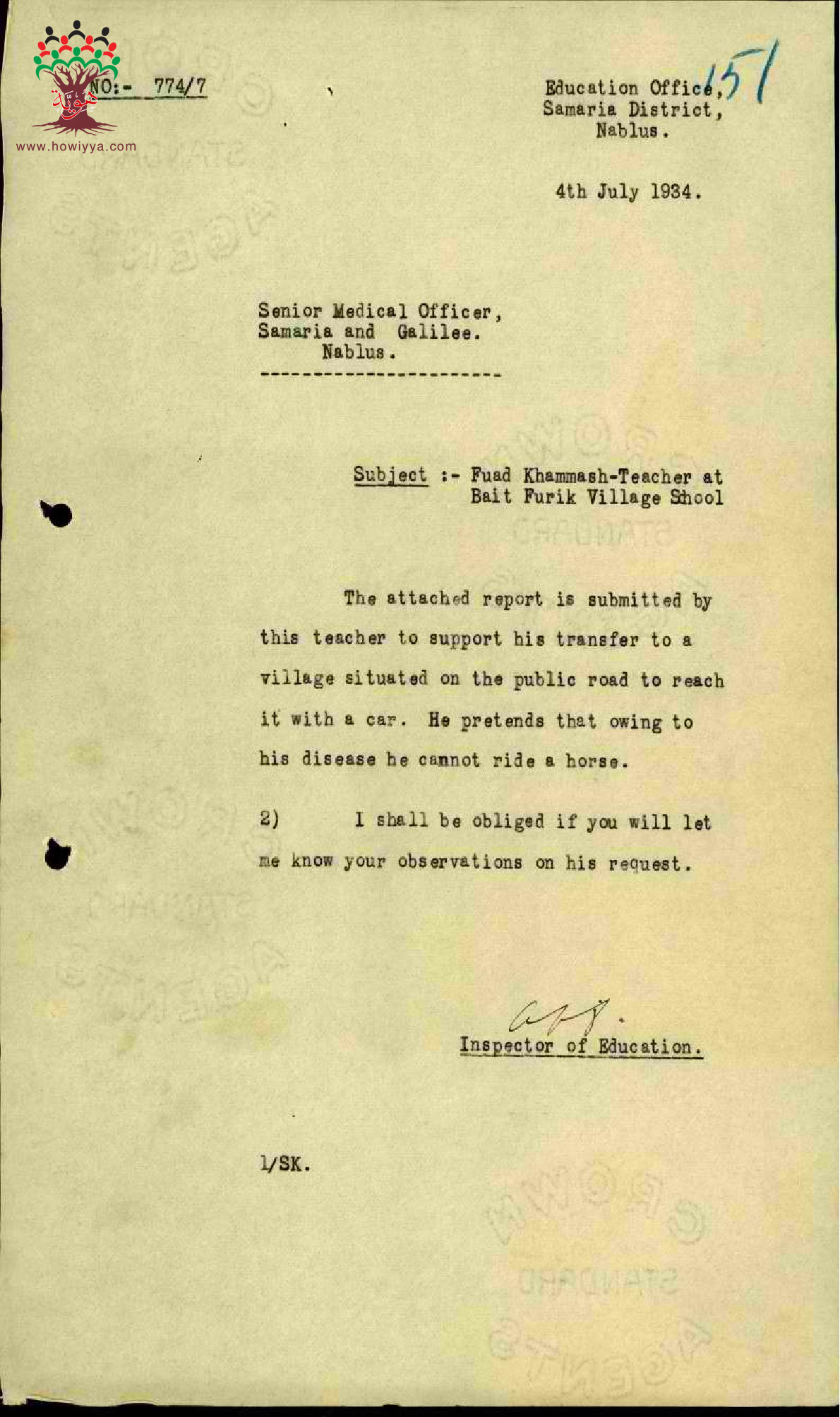رسالة من مفتش المعارف الى مدير المعارف بخصوص طلب المعلم فؤاد خماش نقله الى قرية قريبة يسهل الوصول اليها بوسائل النقل
