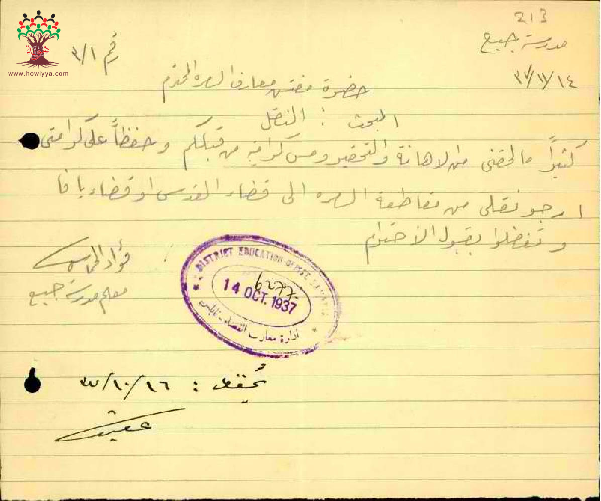 رسالة من المعلم فؤاد خماش الى مفتش المعارف يطلب فيها نقله من مدرسة جبع