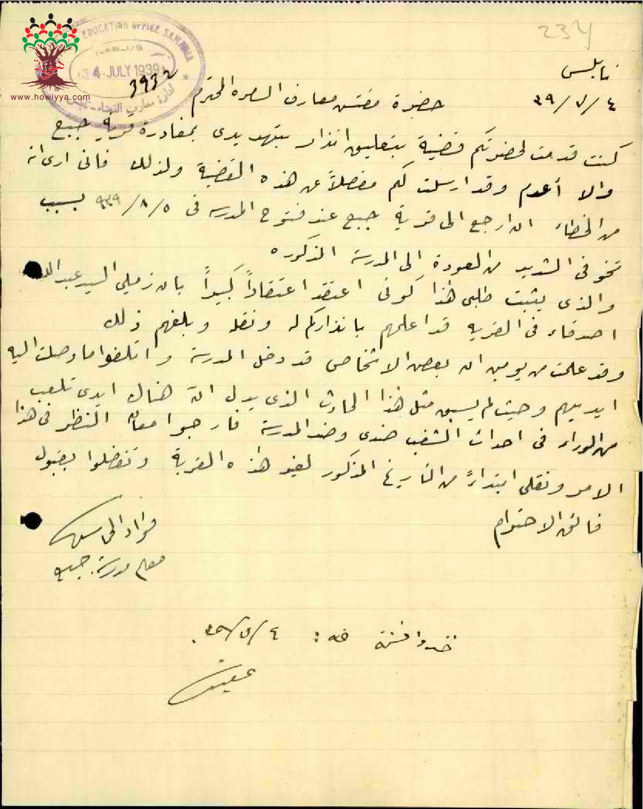 رسالة من المعلم فؤاد خماش الى مفتش المعارف يطلب نقله من مدرسة جبع بسبب قضية تهديده
