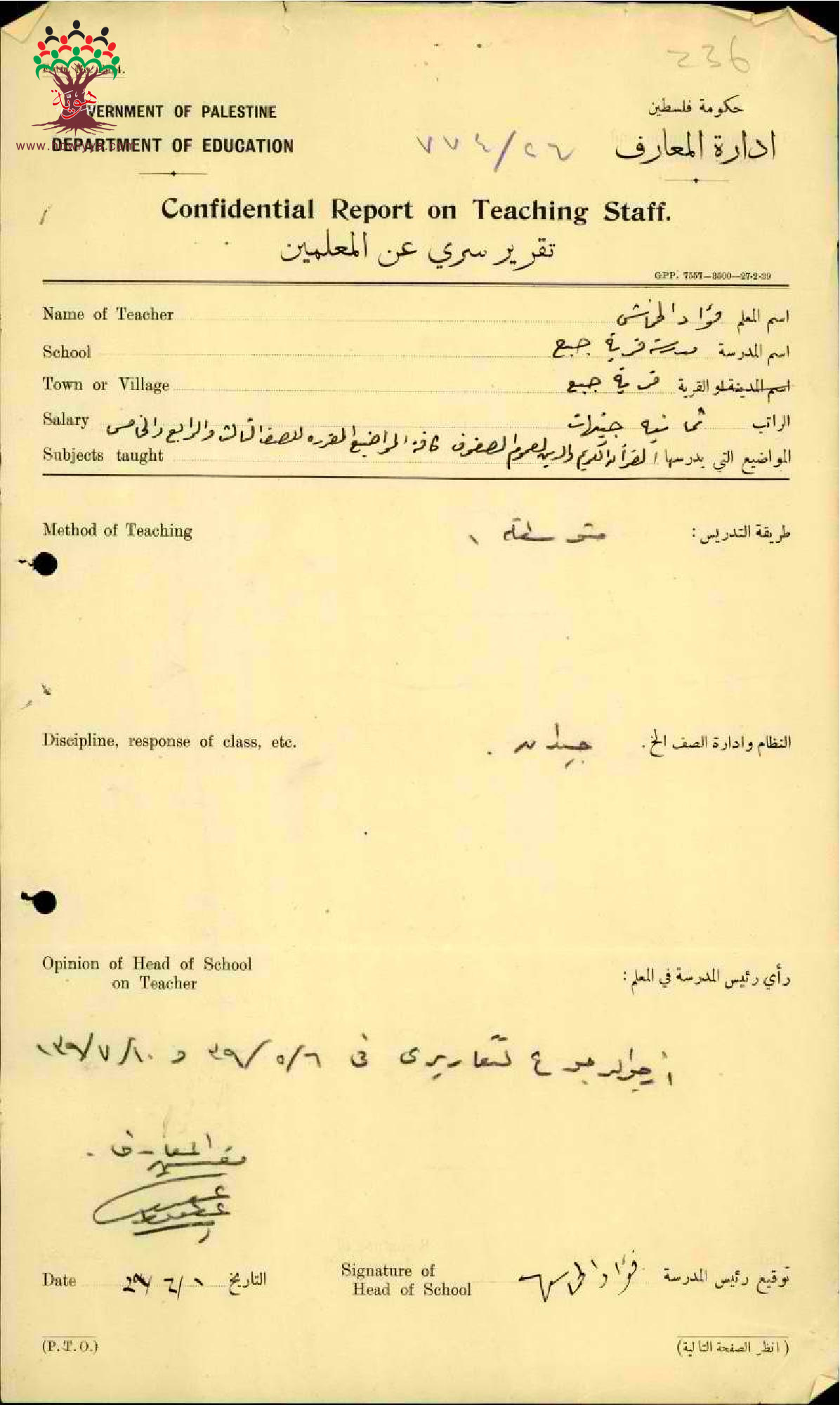 تقرير تفصيلي عن أداء المعلم فؤاد خماش في مدرسة جبع سنة 1939