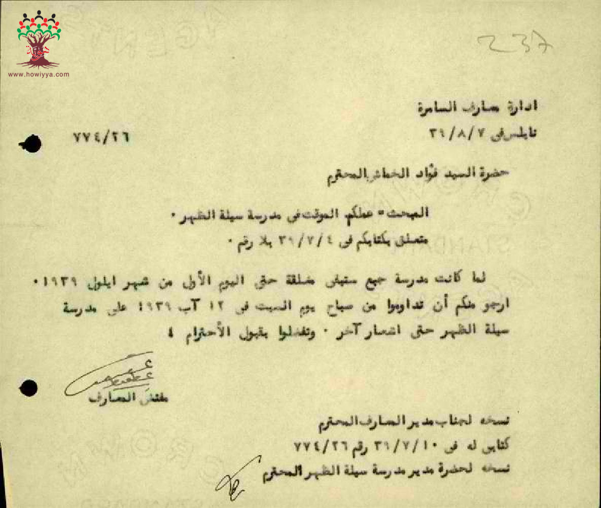 رسالة من مفتش المعارف الى المعلم فؤاد خماش بخصوص نقله الى سيلة الظهر مؤقتا بسبب اغلاق مدرسة جبع
