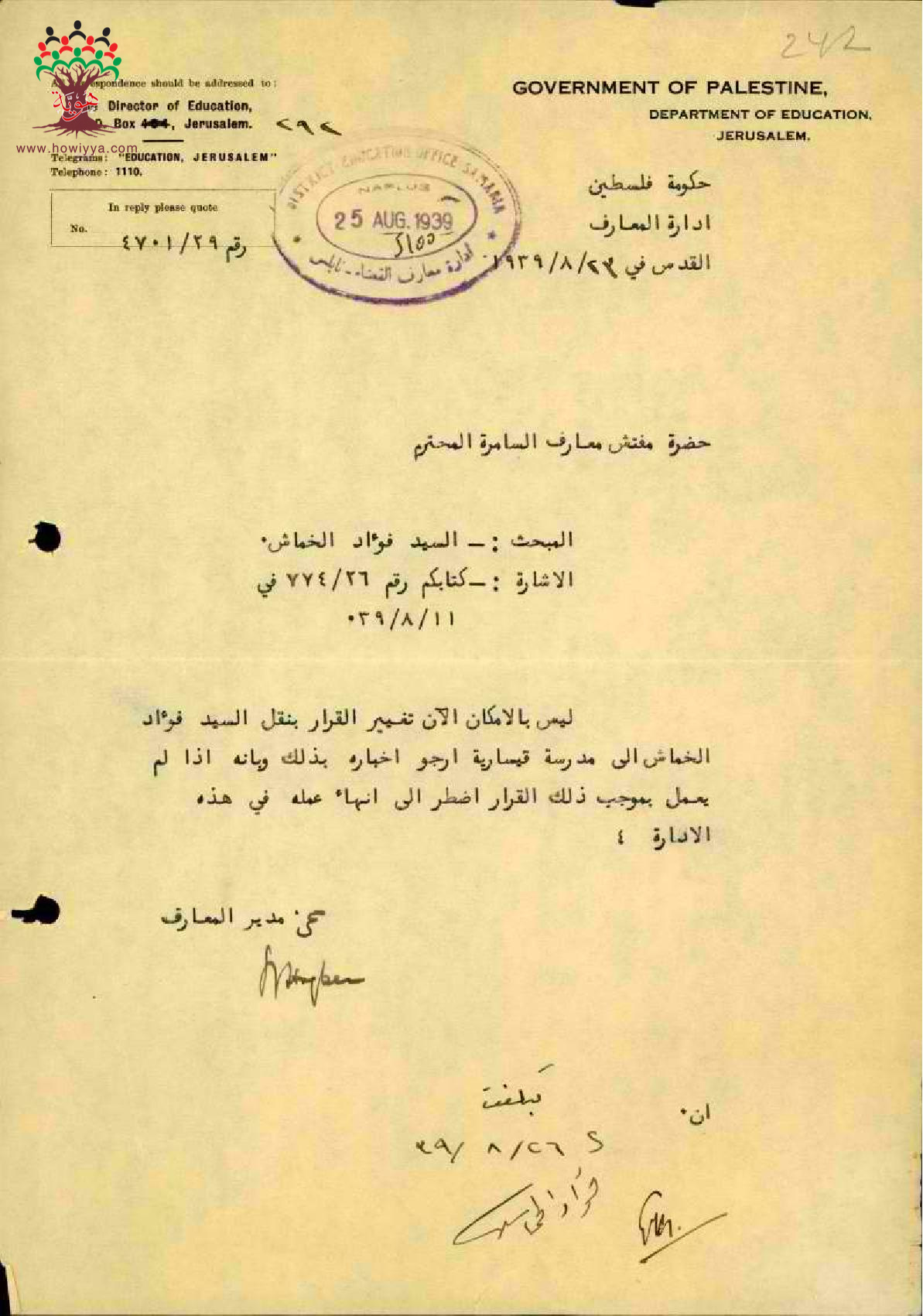 رسالة من مدير المعارف الى مفتش المعارف يخبره بأنه لا يمكن تغيير قرار نقل المعلم فؤاد خماش