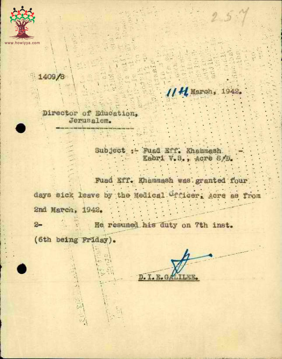 رسالة من مفتش المعارف الى مدير المعارف بخصوص اجازة مرضية للمعلم فؤاد خماش وعودته للعمل