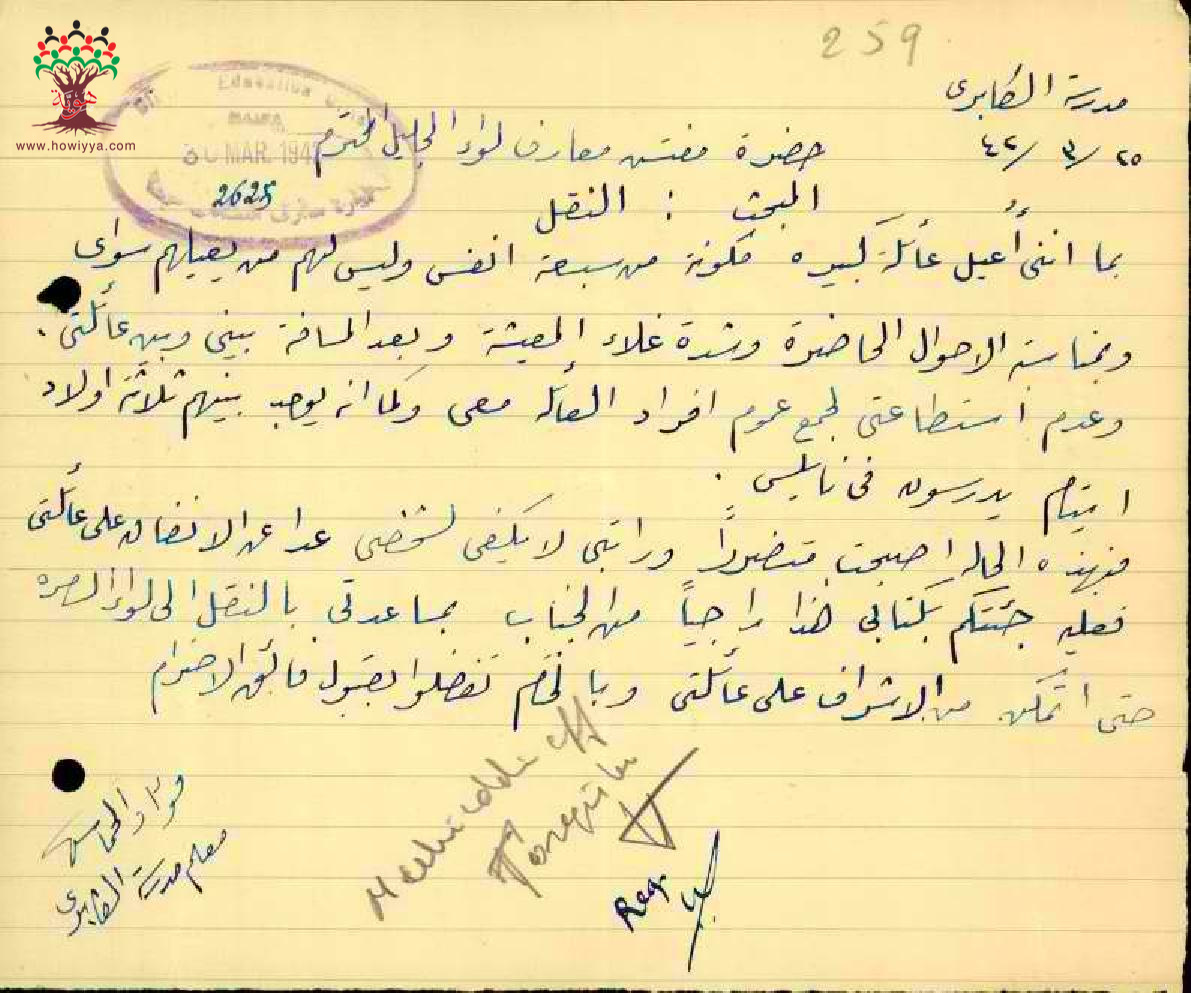 رسالة من المعلم فؤاد خماش الى مفتش المعارف يطلب فيها نقله من مدرسة الكابري