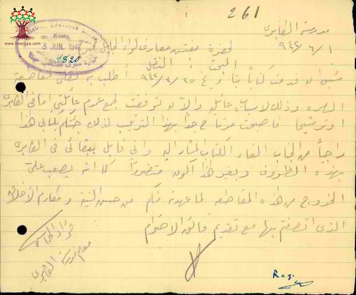 رسالة من المعلم فؤاد خماش الى مفتش المعارف يطلب فيها ابقائه في الكابري والغاء طلب نقله