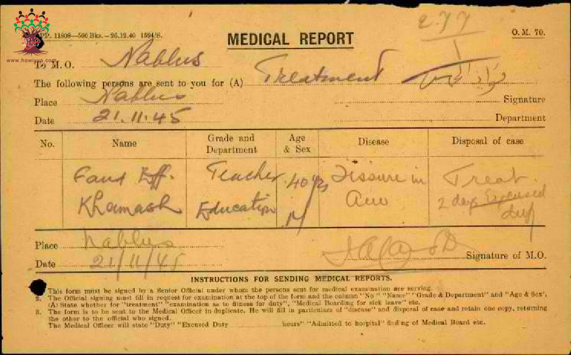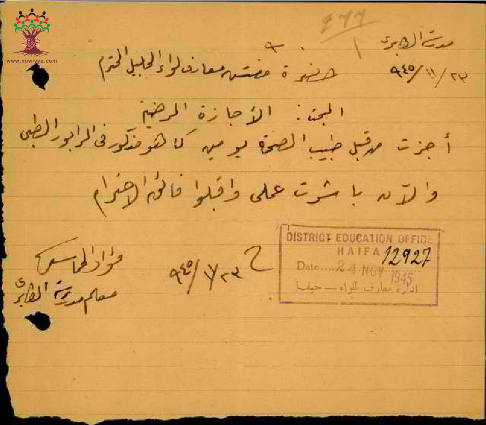 رسالة من المعلم فؤاد خماش الى مفتش المعارف بخصوص تغيبه عن المدرسة مرفقة بالتقرير الطبي
