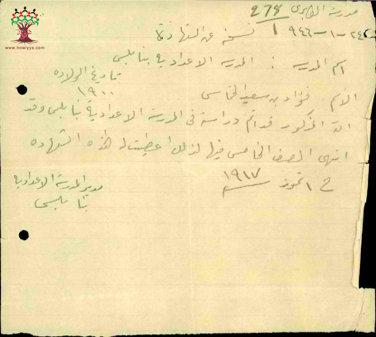 شهادة من مدير مدرسة نابلس بأن المعلم فؤاد خماش قد اتم دراسته حتى الصف الخامس في مدرسة نابلس
